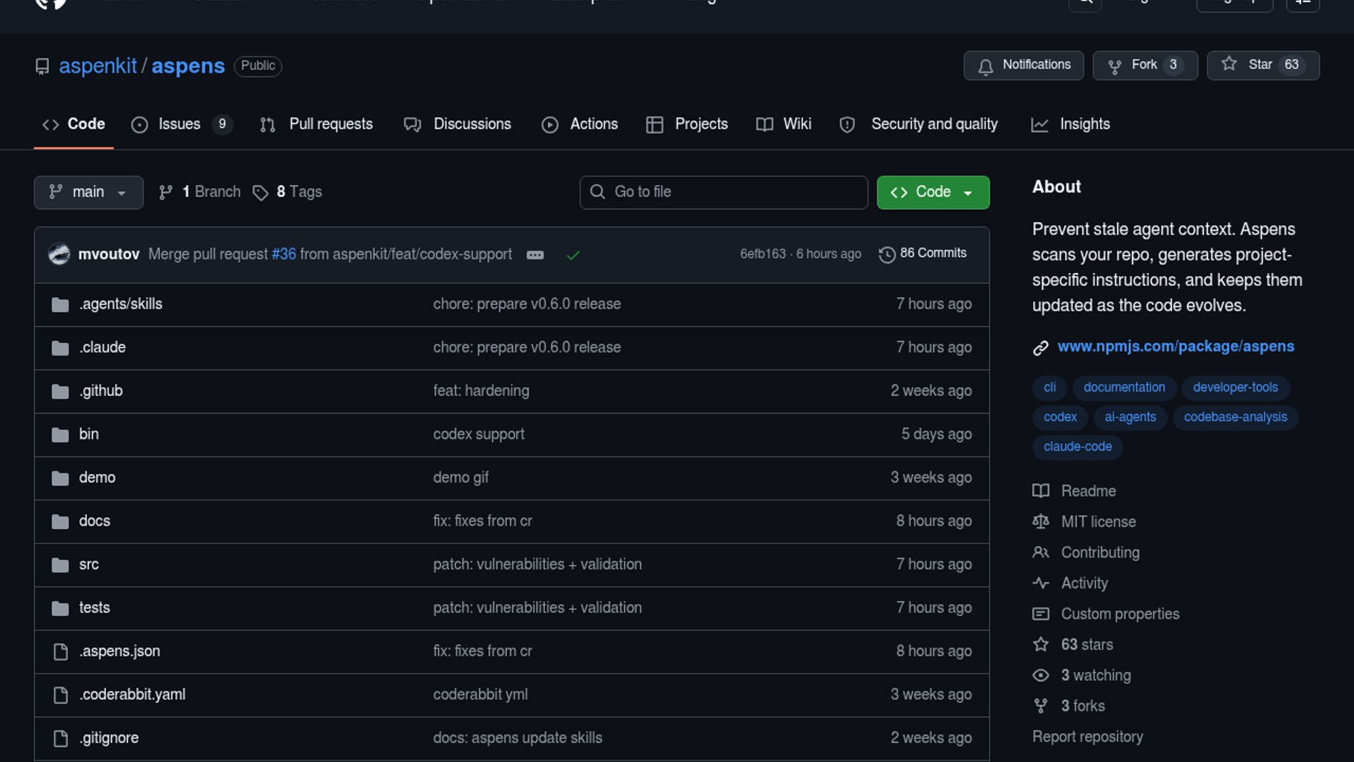 Aspens is an open-source CLI for generating and maintaining repo-specific context files for coding agents. It scans a codebase, builds an import graph, discovers domains and hotspots, and then generates `CLAUDE.md`, `AGENTS.md`, and scoped skill files for Claude Code, Codex, or both. The main pitch is that instead of hand-maintaining separate instruction layers for each model, Aspens keeps them updated on commits through a sync command and optional git hook, so both agents start from the same project knowledge.