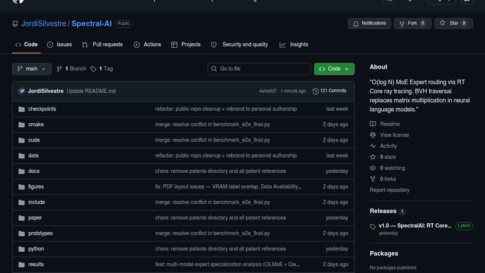 SpectralAI is a research prototype that repurposes NVIDIA RT cores to accelerate Mixture-of-Experts routing on consumer GPUs. The project claims 218x faster routing at batch 1024 on an RTX 5070 Ti, with a small perplexity hit and open reproduction data on Zenodo.