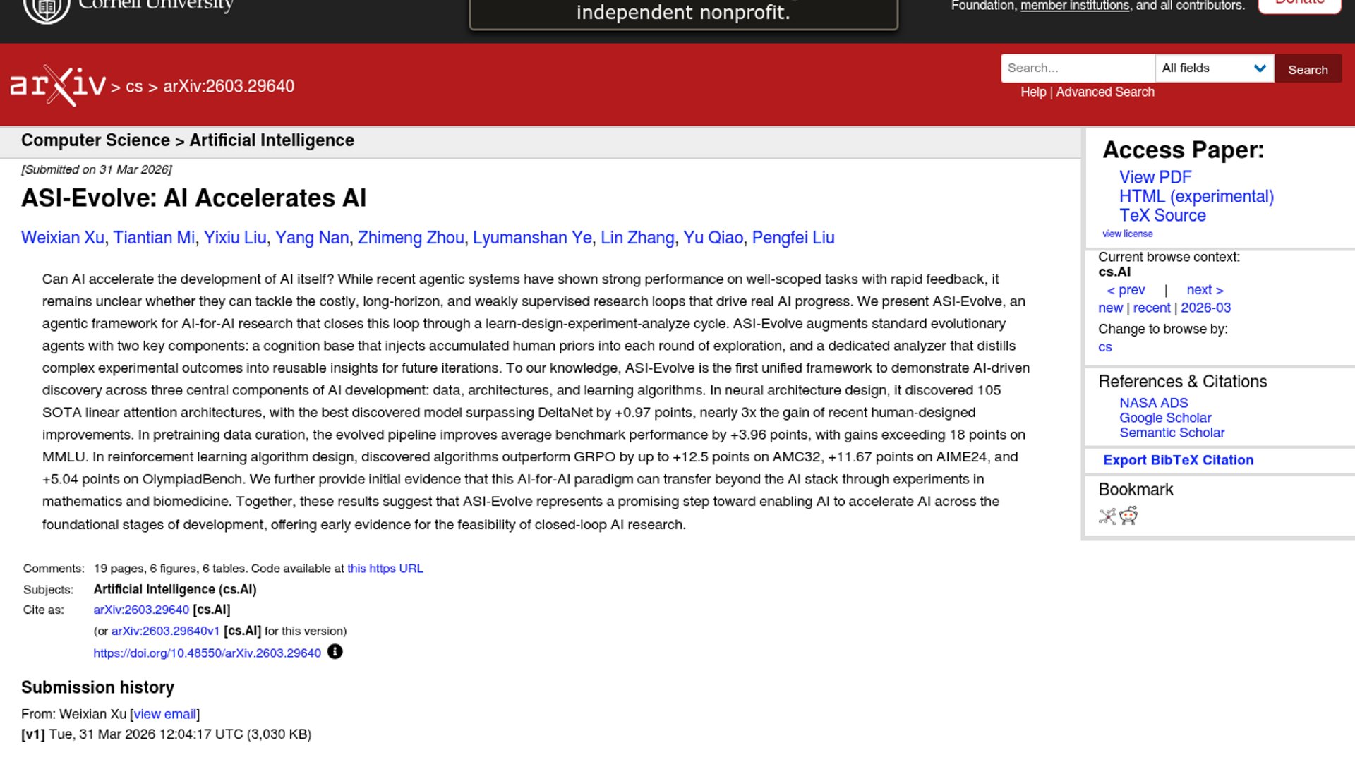 ASI-Evolve is a new arXiv paper proposing an agentic framework for AI-for-AI research that runs a learn-design-experiment-analyze loop. The authors say it found gains across architecture search, data curation, and reinforcement-learning algorithm design, but the system still relies on human-scoped priors and evaluation.