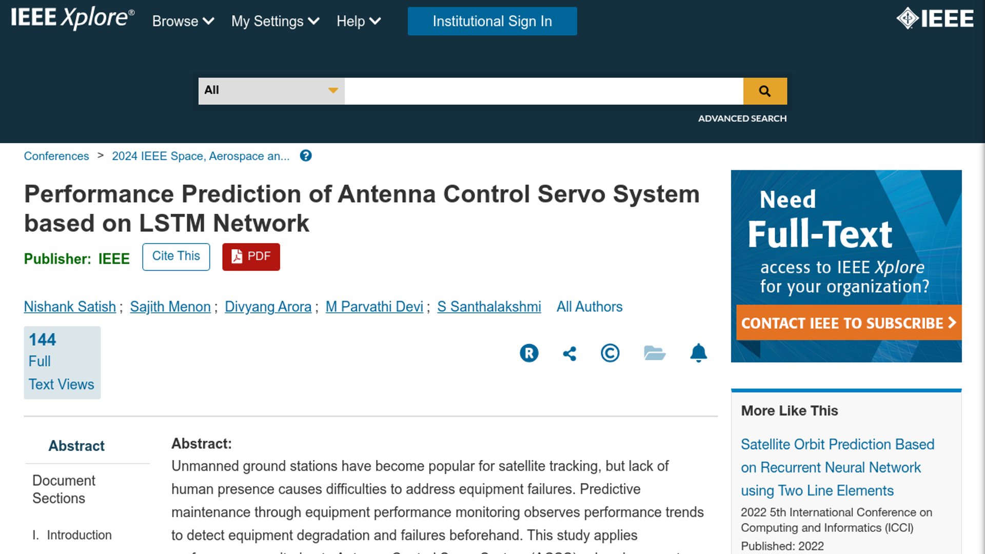 This IEEE SPACE 2024 paper from ISRO-linked authors applies a stacked LSTM to antenna control servo logs to forecast elevation motor current during satellite passes. The idea is predictive maintenance: spot degradation early and reduce the risk of antenna tracking failures.