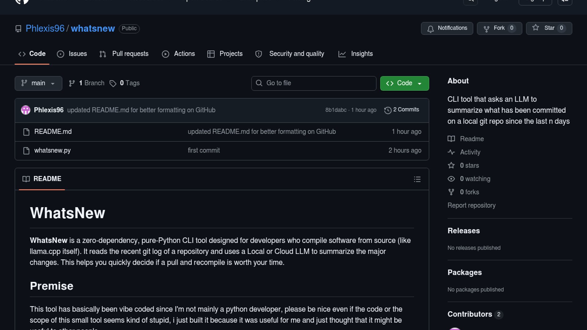 WhatsNew is a small pure-Python command-line tool for local Git repositories that feeds recent commit history into a local or cloud LLM and returns a plain-English summary of what changed over the last N days. It is aimed at developers who regularly pull upstream updates, especially in source-built projects like llama.cpp, and want a fast way to decide whether the changes are worth rebuilding for. The repo says it supports OpenAI-compatible local endpoints plus OpenAI, Anthropic, and Google models, with an interactive setup flow and an optional deep mode that adds file-level stats.
