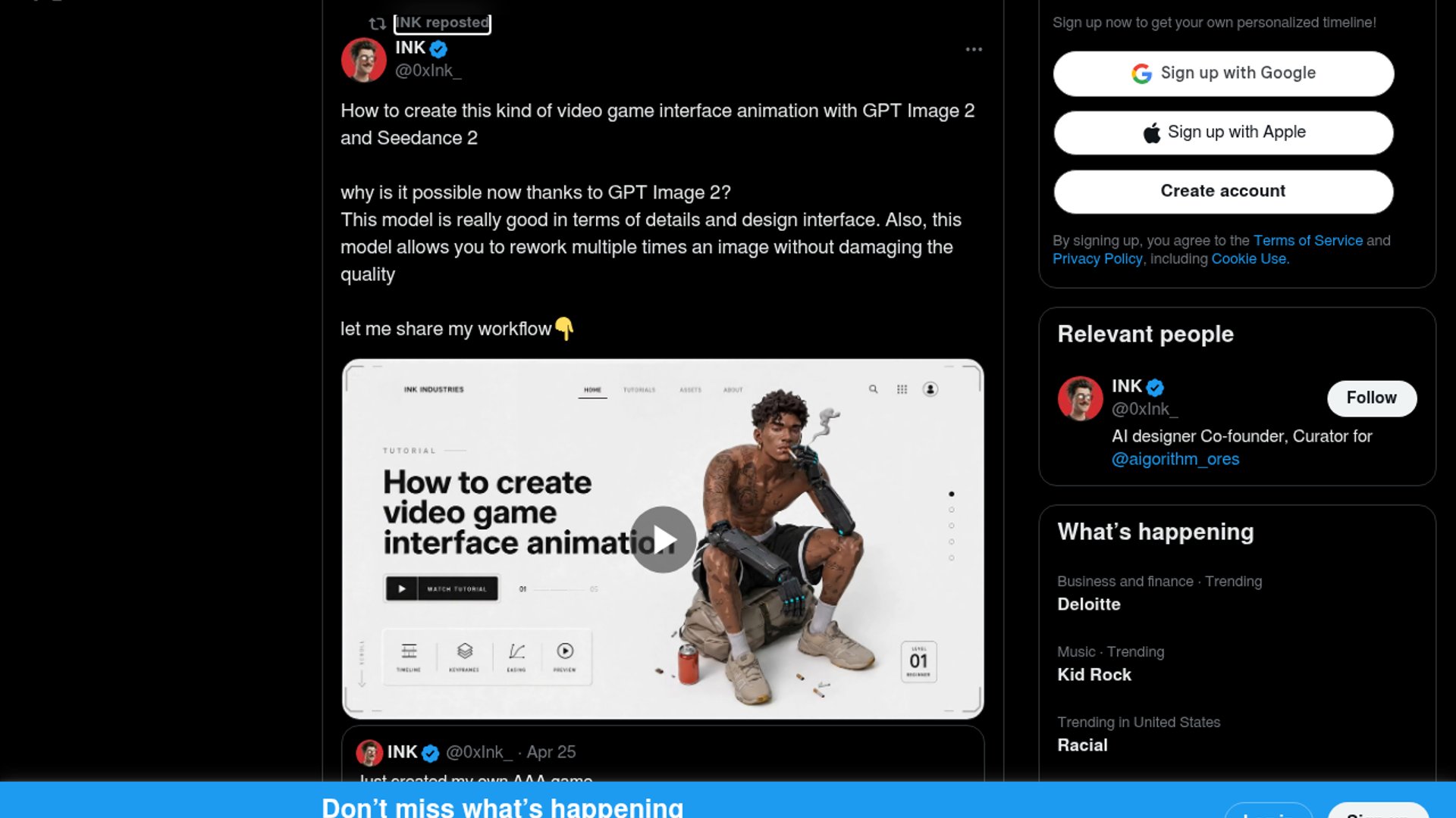 This post is a tutorial demonstrating a two-step pipeline for making video game interface animations: use GPT Image 2 to generate and iterate on clean UI/keyframe images, then feed those frames into Seedance 2.0 to add motion and camera movement. The appeal is that GPT Image 2 preserves fine interface detail across revisions, while Seedance 2.0 handles the animation pass well enough to make the result feel like a polished game trailer or in-game UI sequence.