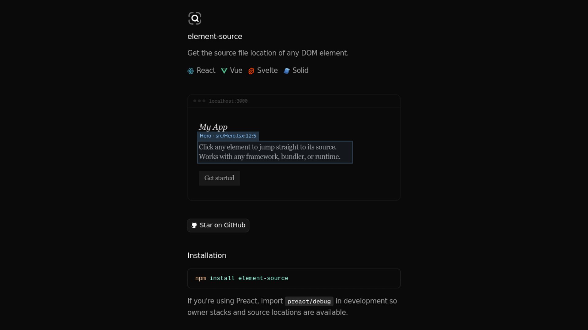 element-source is an open-source library that resolves any DOM element to its source file, line, and component stack across React, Vue, Svelte, Solid, and Preact. It’s especially handy for agentic debugging, since tools can jump from the UI straight to the originating code.
