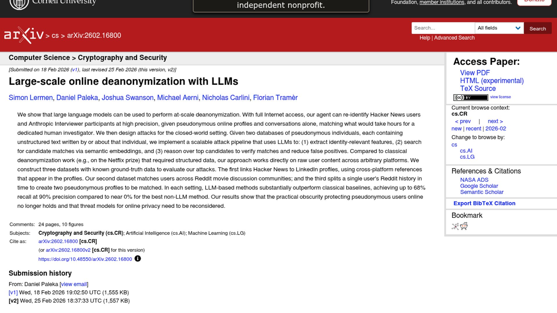 Researchers from ETH Zurich and Anthropic demonstrate that LLMs can link pseudonymous Reddit and Hacker News accounts to real identities with 90%+ precision. By reasoning over unstructured post history, the AI automates identity matching at a scale and cost impossible for humans.