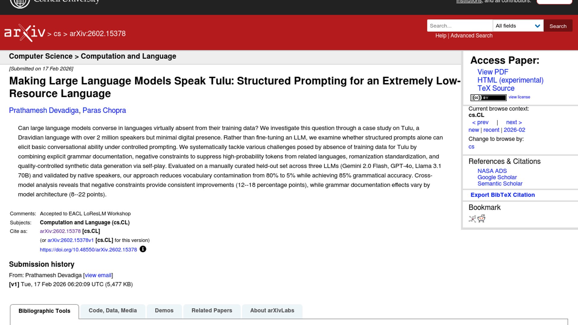 This paper shows that a carefully structured prompt can get GPT-4o, Gemini 2.0 Flash, and Llama 3.1 70B to generate much cleaner Tulu without any fine-tuning, cutting Kannada vocabulary bleed from 80% to 5% and reaching 85% grammatical accuracy. It is a sharp result for low-resource language work because it treats prompt design itself as the intervention, not model retraining.