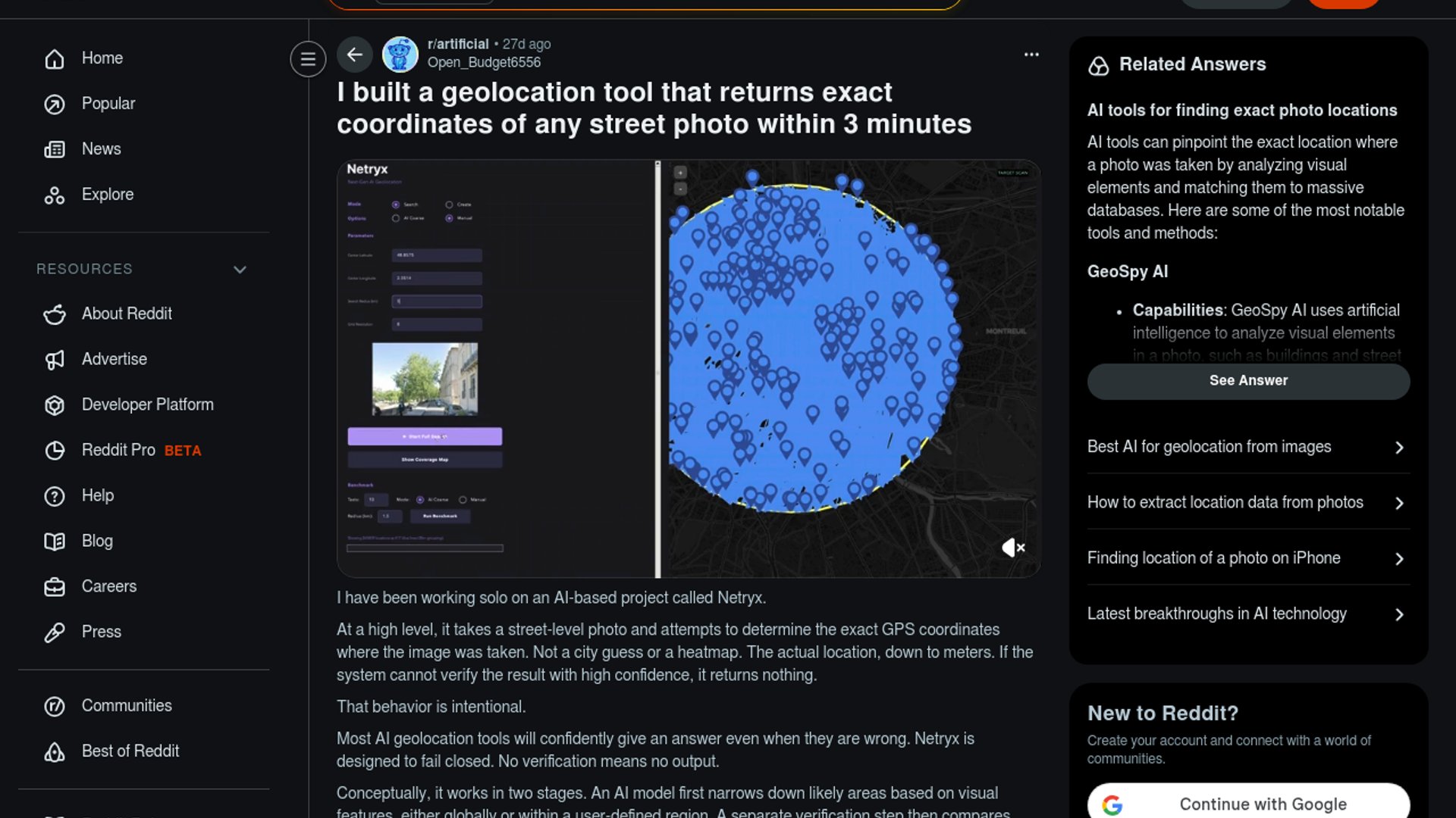 - –Earlier February posts positioned Netryx as a tool that could recover exact coordinates from ordinary street photos; this Reddit post applies that same pitch to a live geopolitical event.