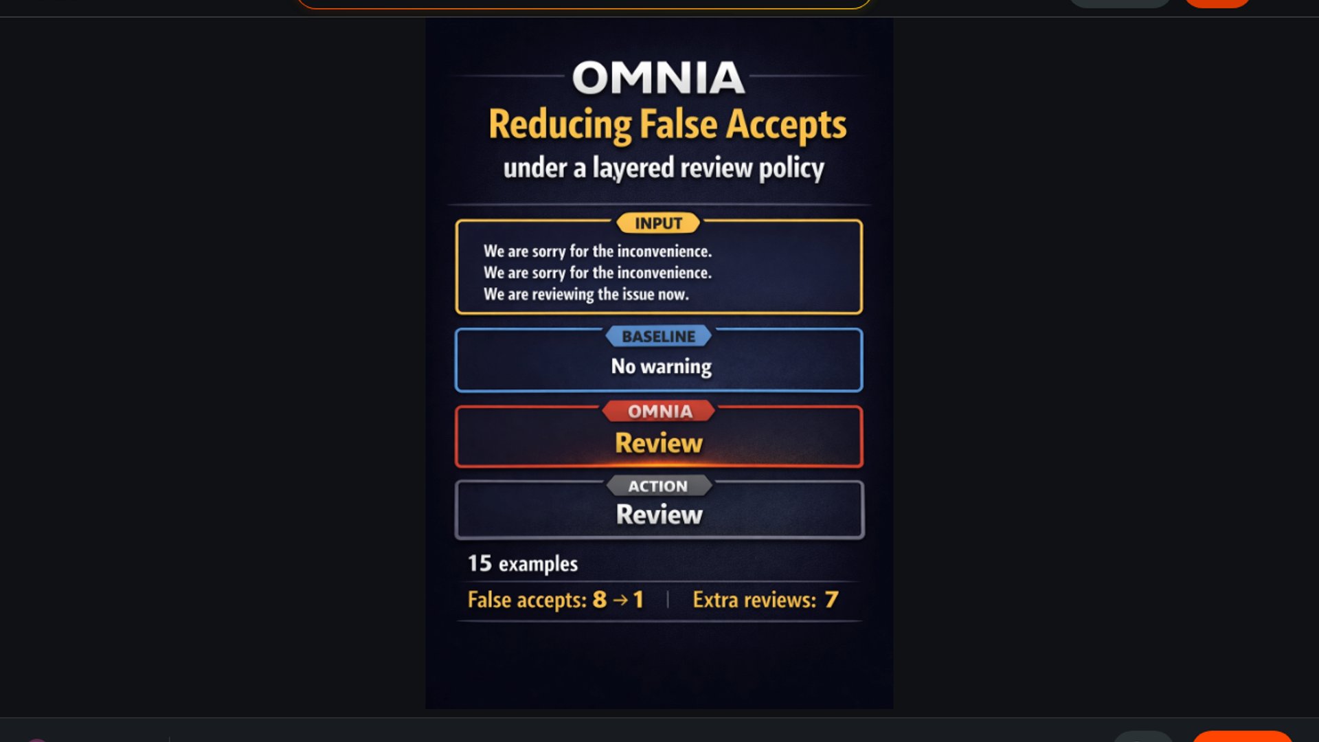 OMNIA is a post-hoc structural review layer for LLM outputs that aims to flag suspicious-clean text without changing inference or making the final decision. On a 15-example support-style set, it reportedly reduced false accepts from 8 to 1 under a layered policy, at the cost of 7 extra reviews.