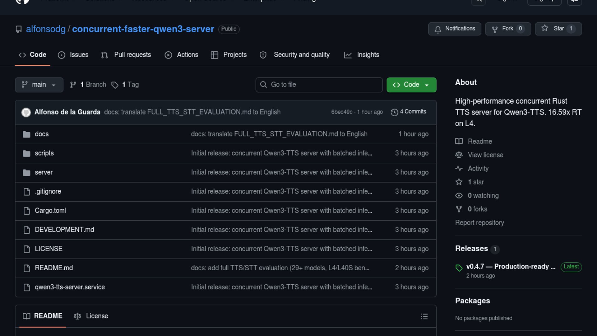 concurrent-faster-qwen3-server is an open-source Rust TTS server for Qwen3-TTS-12Hz-0.6B-Base that focuses on high-throughput concurrent inference. The project turns an upstream single-stream engine into a batched serving stack with voice cloning, streaming output, adaptive batching, and OOM recovery. According to the repo, it reaches 16.59x real-time at batch 16 on a single NVIDIA L4, with a claim of 18x improvement over the upstream engine in the headline benchmark path.