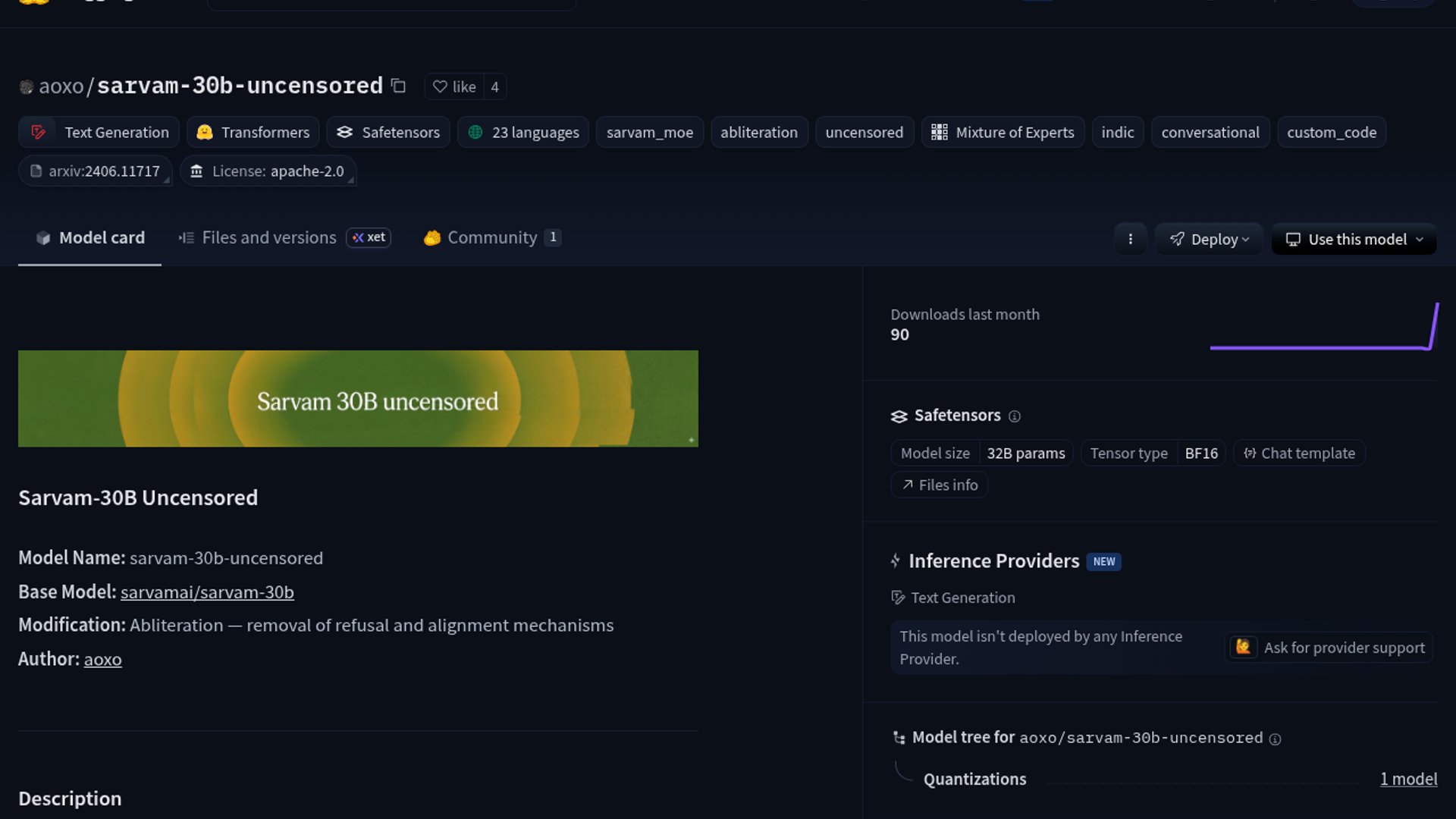- –The model card says it preserves Sarvam-30B’s architecture and capabilities while projecting out refusal directions across 19 layers and the lm_head, making this more than a simple jailbreak prompt pack
