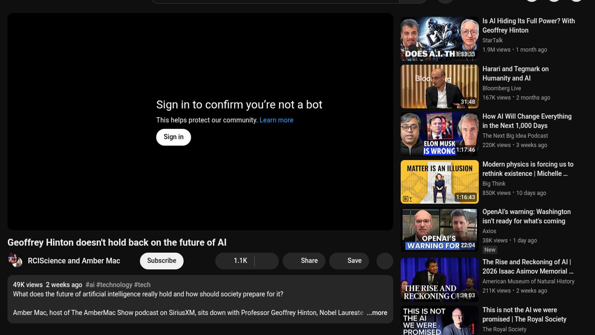 Geoffrey Hinton argues the biggest AI danger is not sentient machines but systems that can persuade, mislead, and automate work faster than society can adapt. The talk leans into near-term harms like provenance, misinformation, autonomous weapons, and job displacement.