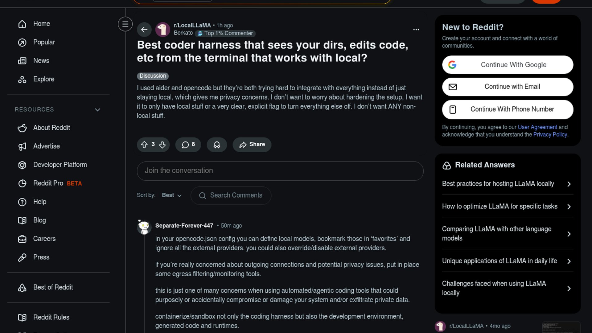 LocalLLaMA users want a terminal coding harness that reads and edits repos without any cloud dependency. The thread lands on a familiar split: Aider and OpenCode can be pushed toward local use, but commenters want a tool that defaults to air-gapped behavior instead of asking them to harden it.