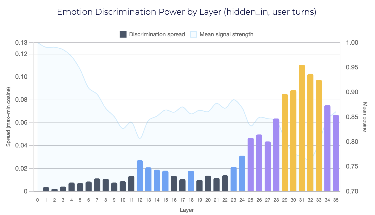 - –The strongest developer takeaway is efficiency: the author claims layers 2, 14, 23, 29-31, and 33 capture most of the useful emotion signal, which could make activation monitoring practical.