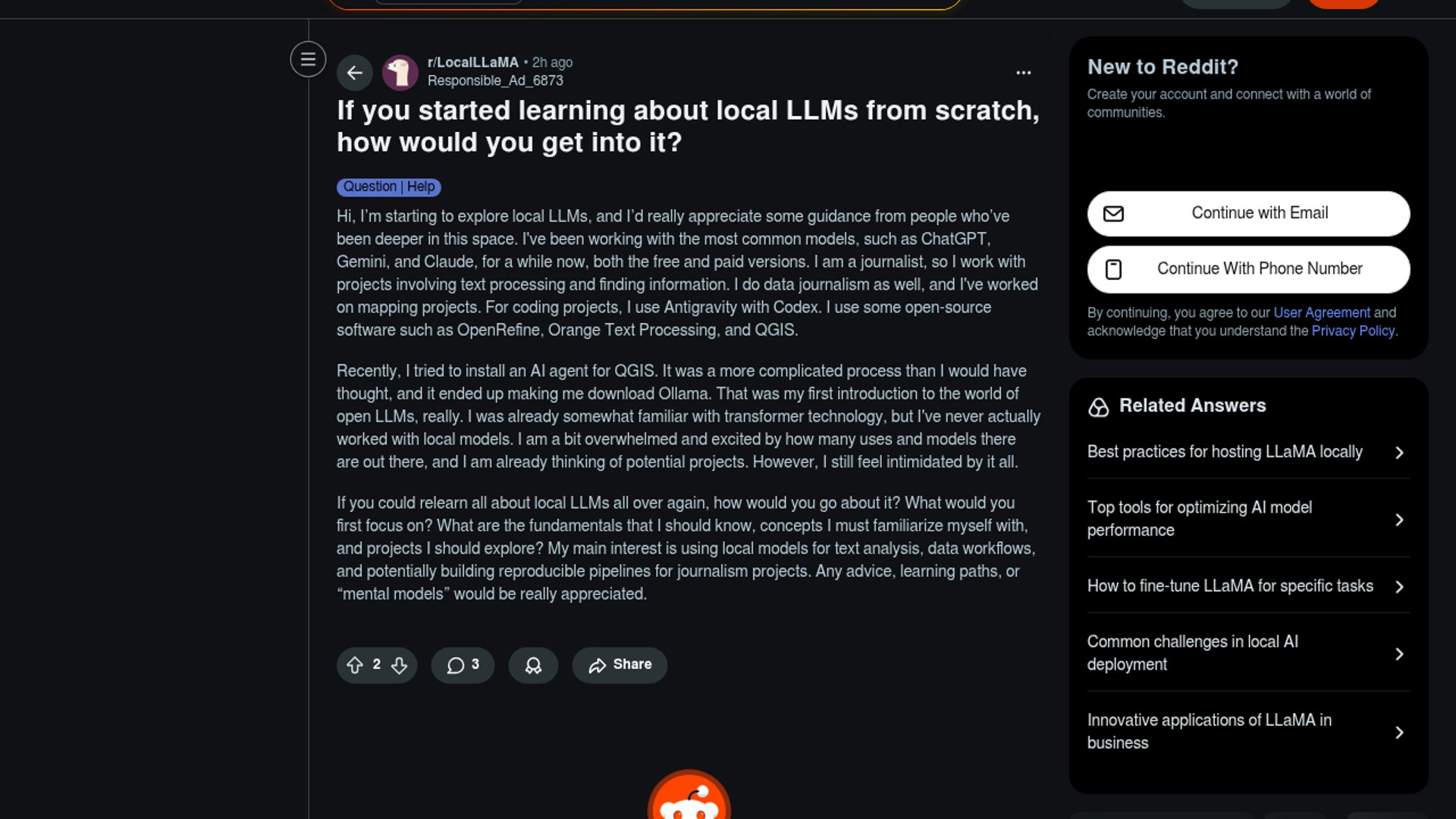 A journalist new to local LLMs asks for a sane starting point after Ollama became their first real exposure to open models. They want fundamentals, learning paths, and practical projects for text analysis, data workflows, and reproducible reporting.