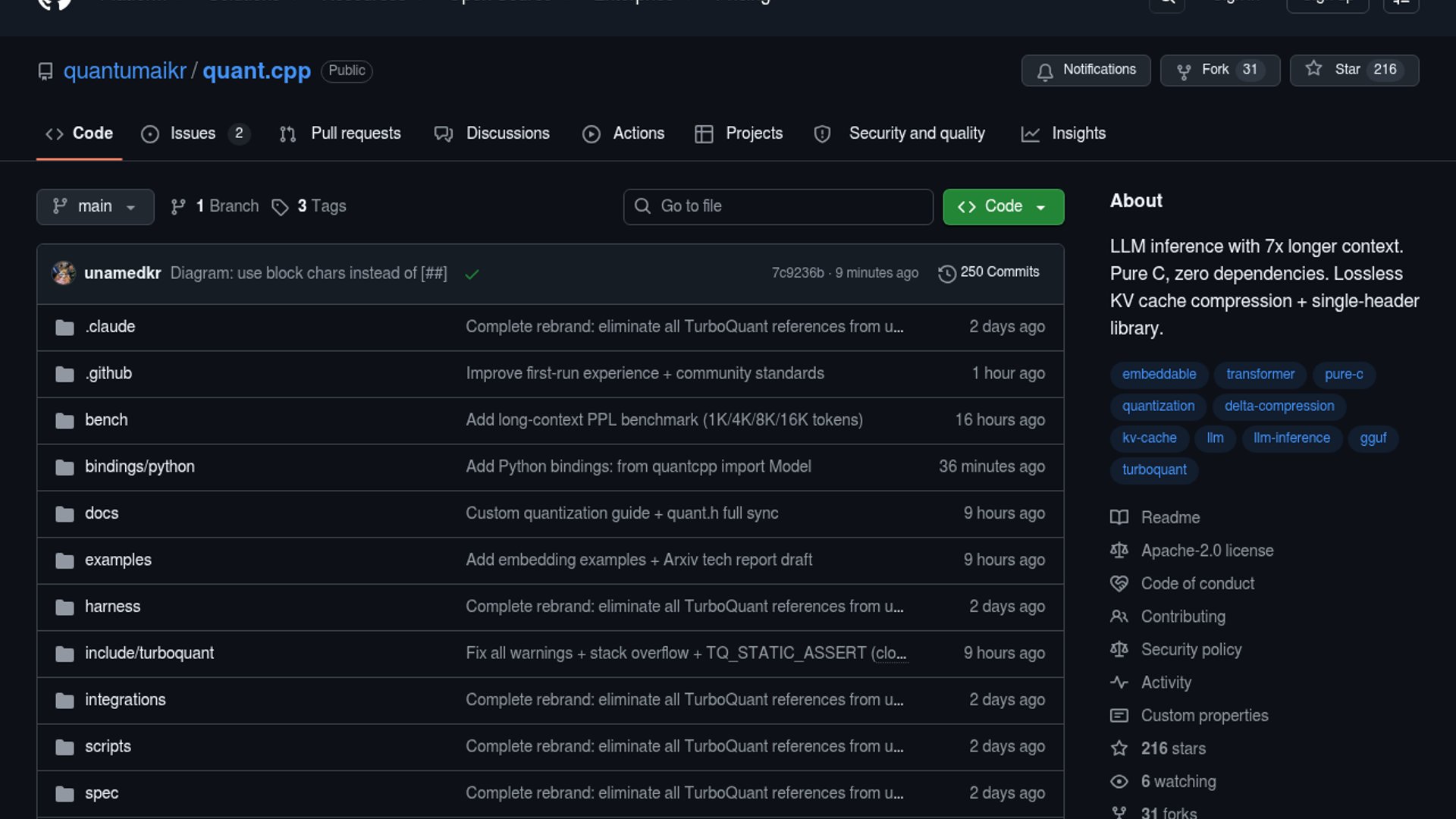 - –The main value prop is context length, not raw throughput: the repo explicitly says to use llama.cpp for speed and quant.cpp for fitting more context in less memory.