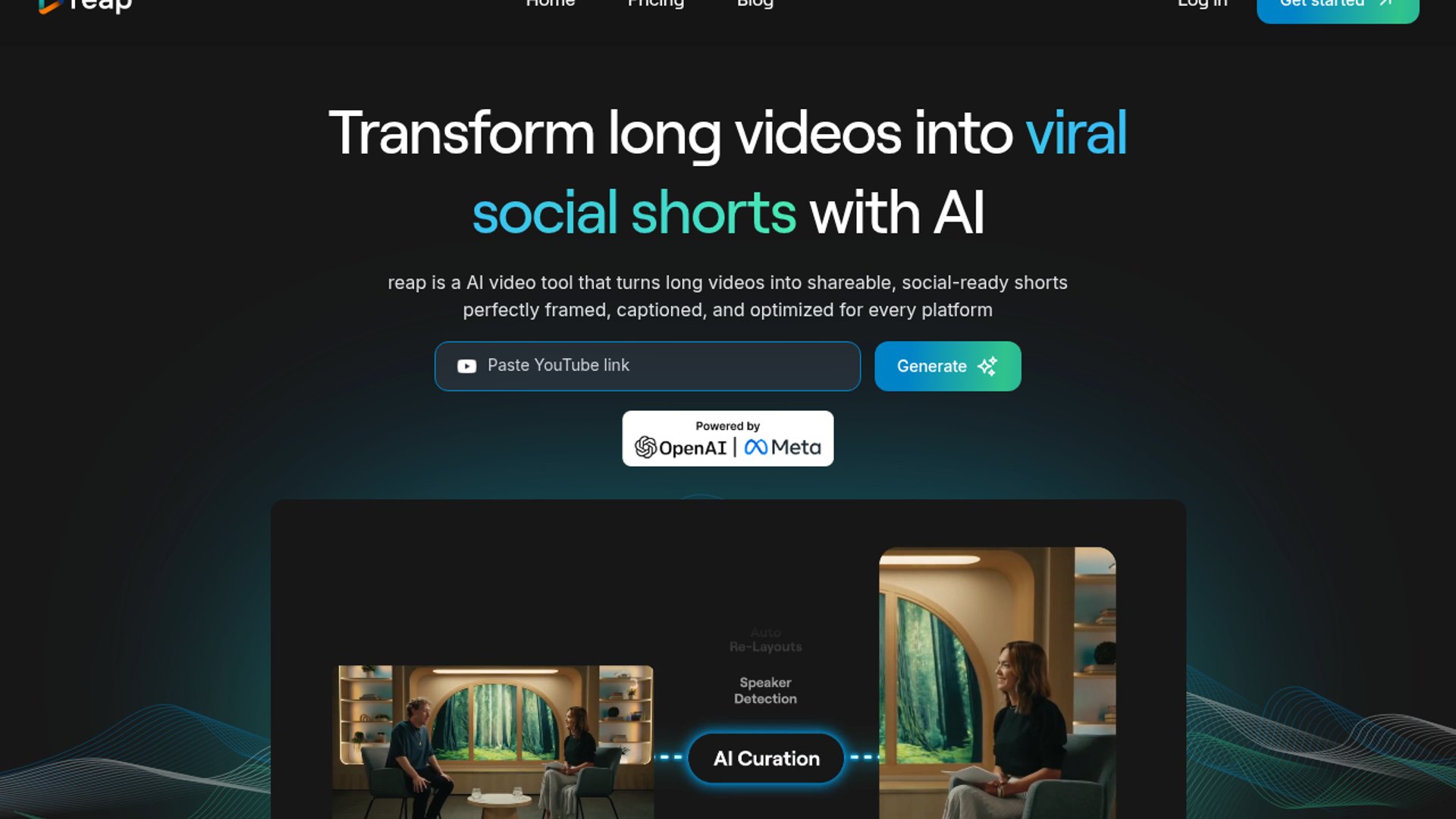 Reap's AI video repurposing platform transforms long-form content into viral-ready social clips with automated reframing, speaker tracking, and global localization via AI dubbing in over 80 languages. It's built for high-volume content pipelines with a transcript-based editor and automated b-roll integration.