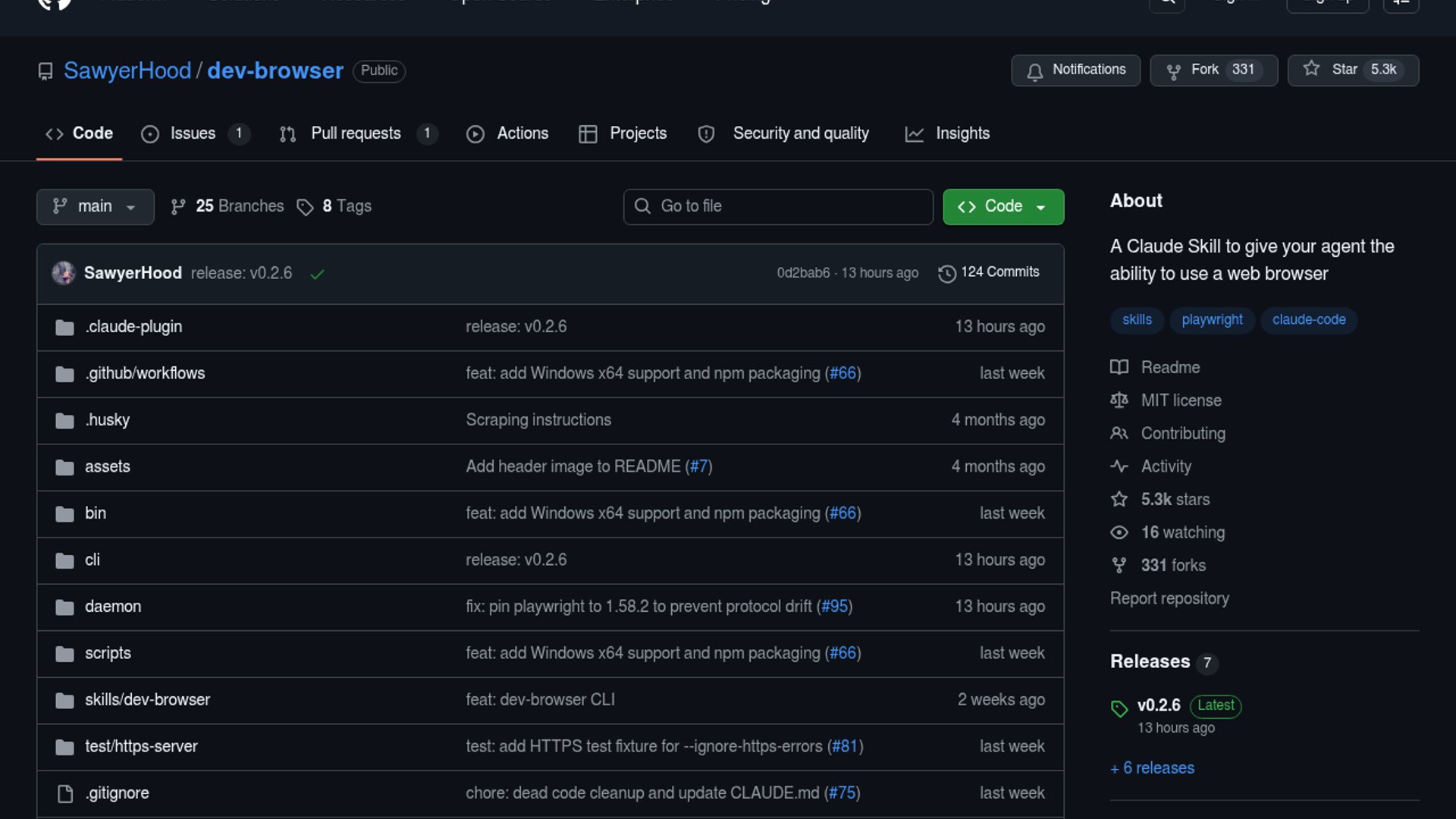 Dev Browser is an open-source Claude Skill for browser automation that lets agents drive web pages with sandboxed JavaScript and a Playwright-style API. Version v0.2.6 is a maintenance release that pins Playwright to 1.58.2 to avoid protocol drift.