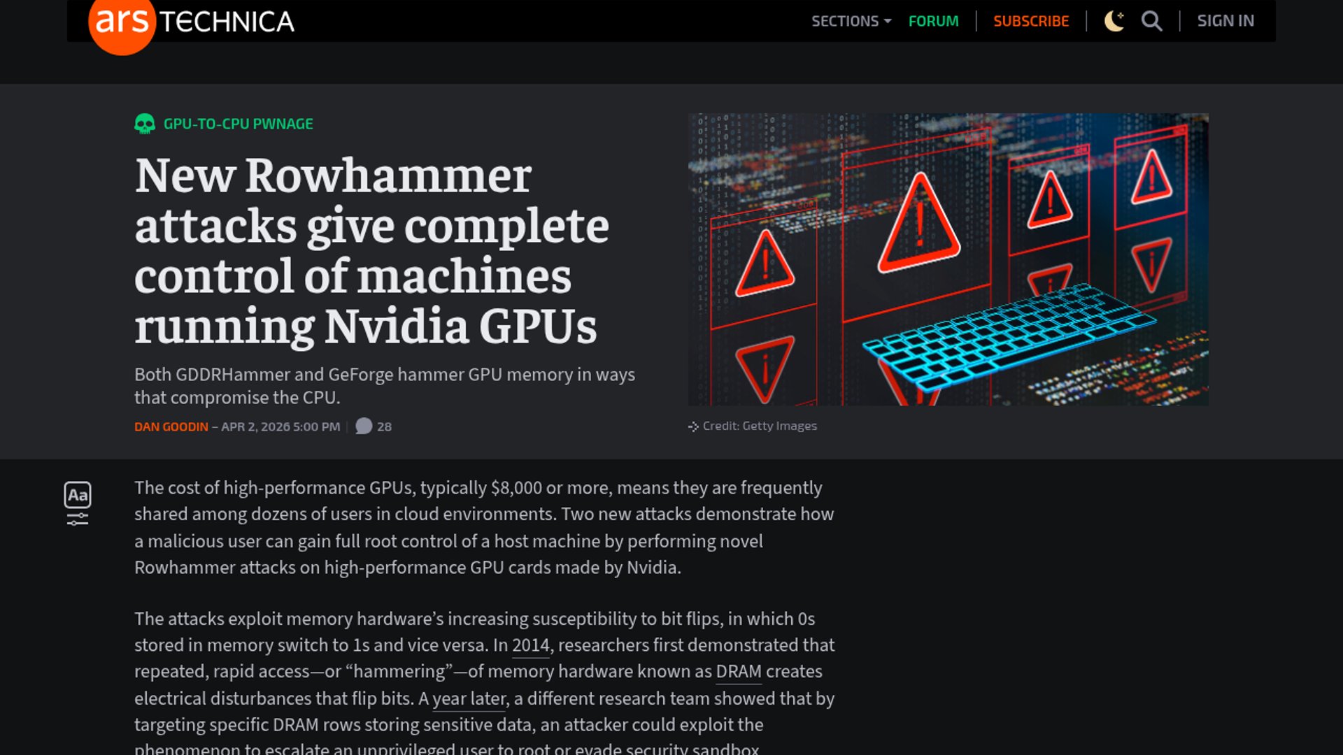 Researchers behind two new attacks, GDDRHammer and GeForge, showed that Rowhammer-style bit flips in GDDR6 GPU memory can break Nvidia GPU isolation and escalate to full host compromise. The work, disclosed at gddr.fail and covered by Ars Technica, demonstrates root shell access on vulnerable systems, with impact centered on specific Ampere-era Nvidia cards and configurations where protections like IOMMU and ECC are not enabled.