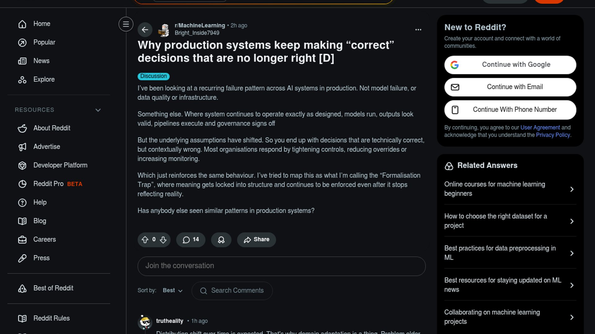 A Reddit discussion describes a production AI failure mode where systems stay healthy on paper while the world around them changes. The post calls this the “Formalisation Trap” and argues that tighter controls can harden stale assumptions instead of correcting them.
