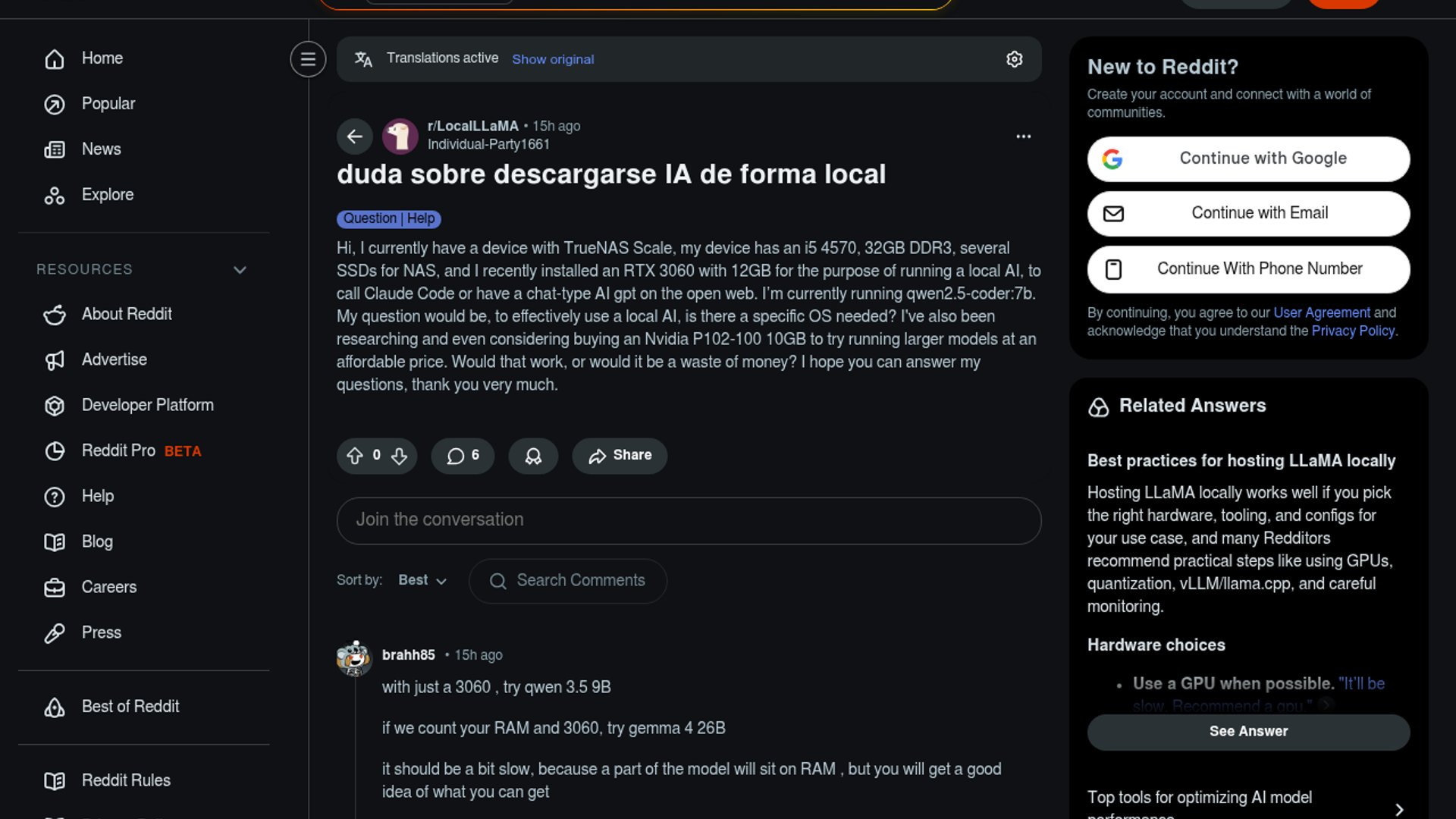 El post pregunta si hace falta un sistema operativo concreto para sacar partido a una IA local en un TrueNAS Scale con i5-4570, 32 GB de RAM y una RTX 3060 de 12 GB. También plantea si una Nvidia P102-100 barata merece la pena para mover modelos más grandes sin disparar el presupuesto.