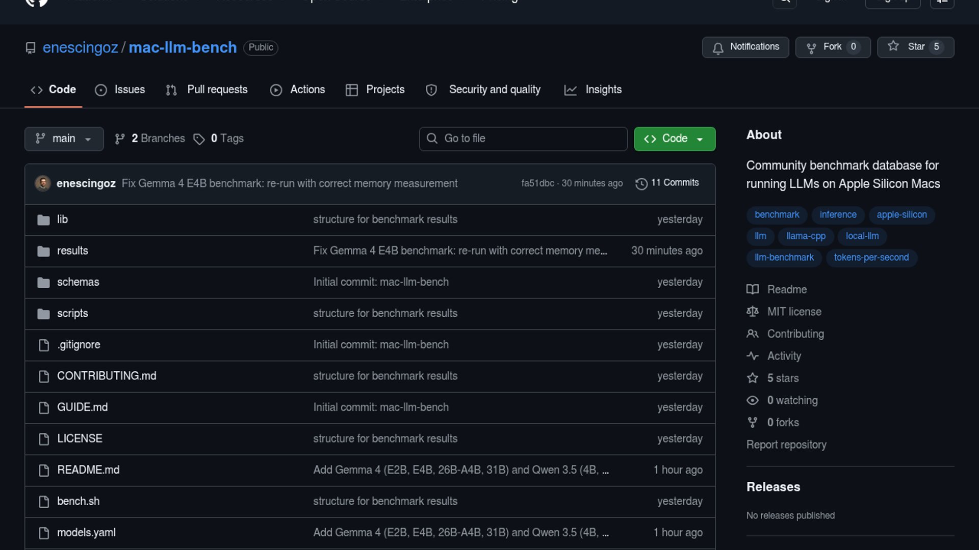 Open-source project mac-llm-bench provides a community-driven database for comparing local LLM performance across Apple Silicon hardware. The initial benchmark of 37 models on a 32GB M5 MacBook Air highlights MoE architectures as the optimal choice for consumer hardware, and invites developers to submit their own results.