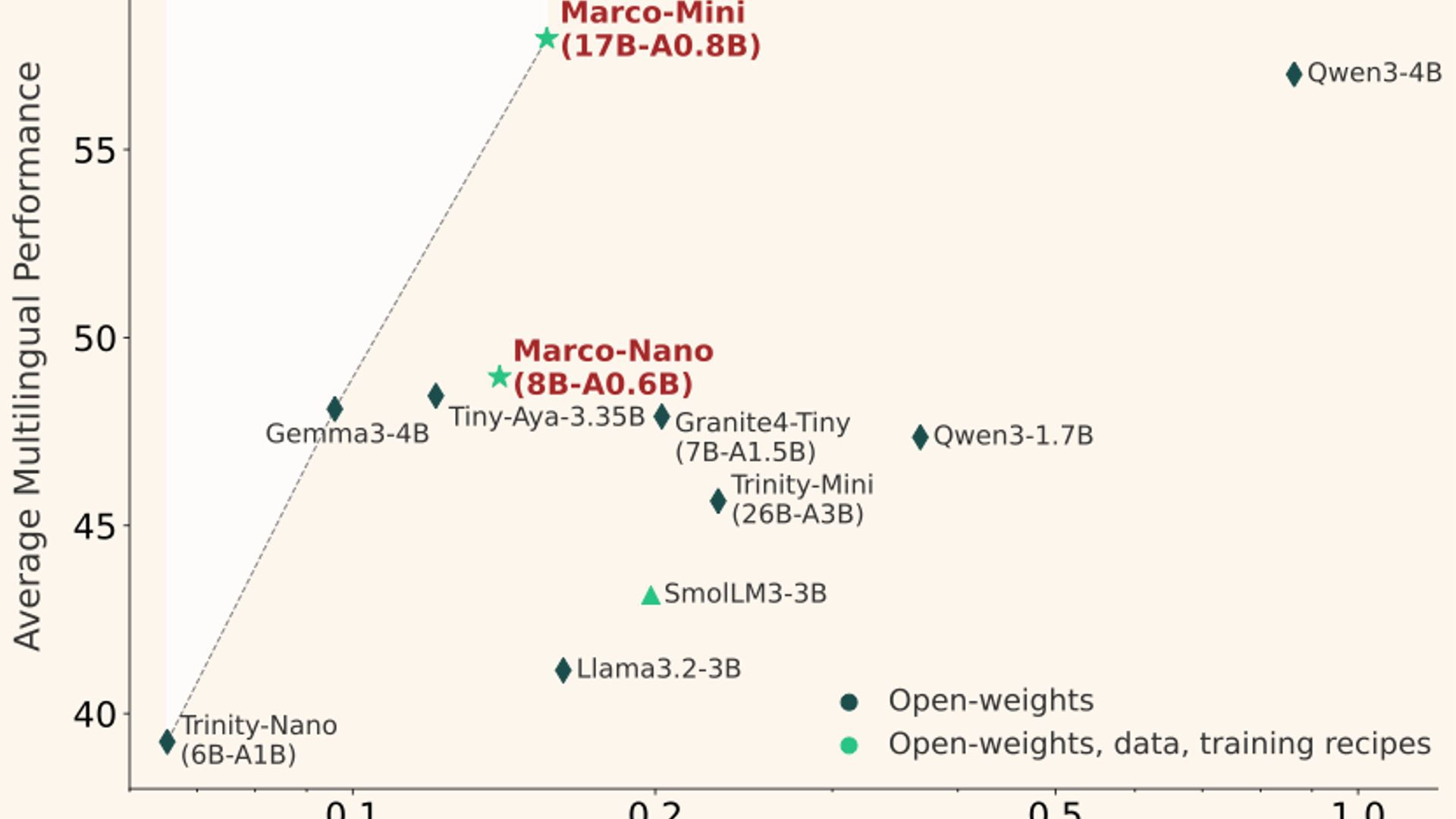 Alibaba International’s Marco-MoE family adds two new sparse instruction models: Marco-Mini-Instruct and Marco-Nano-Instruct. The releases emphasize extreme MoE efficiency, with 17.3B total parameters but just 0.86B active for Mini, and 8B total with 0.6B active for Nano, alongside strong multilingual benchmark claims.