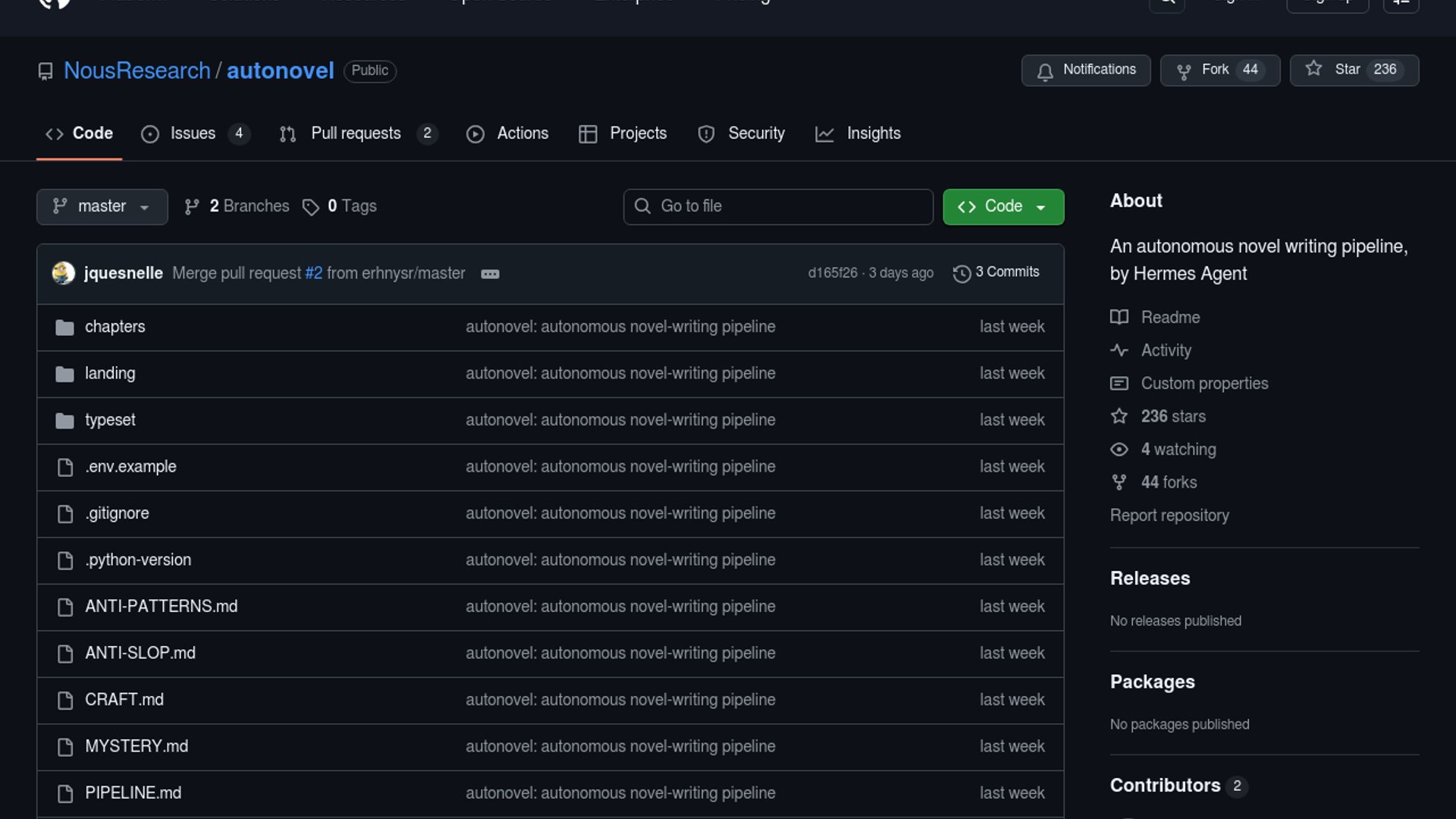 NousResearch has released Autonovel, an open-source pipeline that uses the Hermes Agent to autonomously write full-length novels. The tool aims to streamline long-form creative writing by managing the complexities of narrative generation through structured agent workflows.