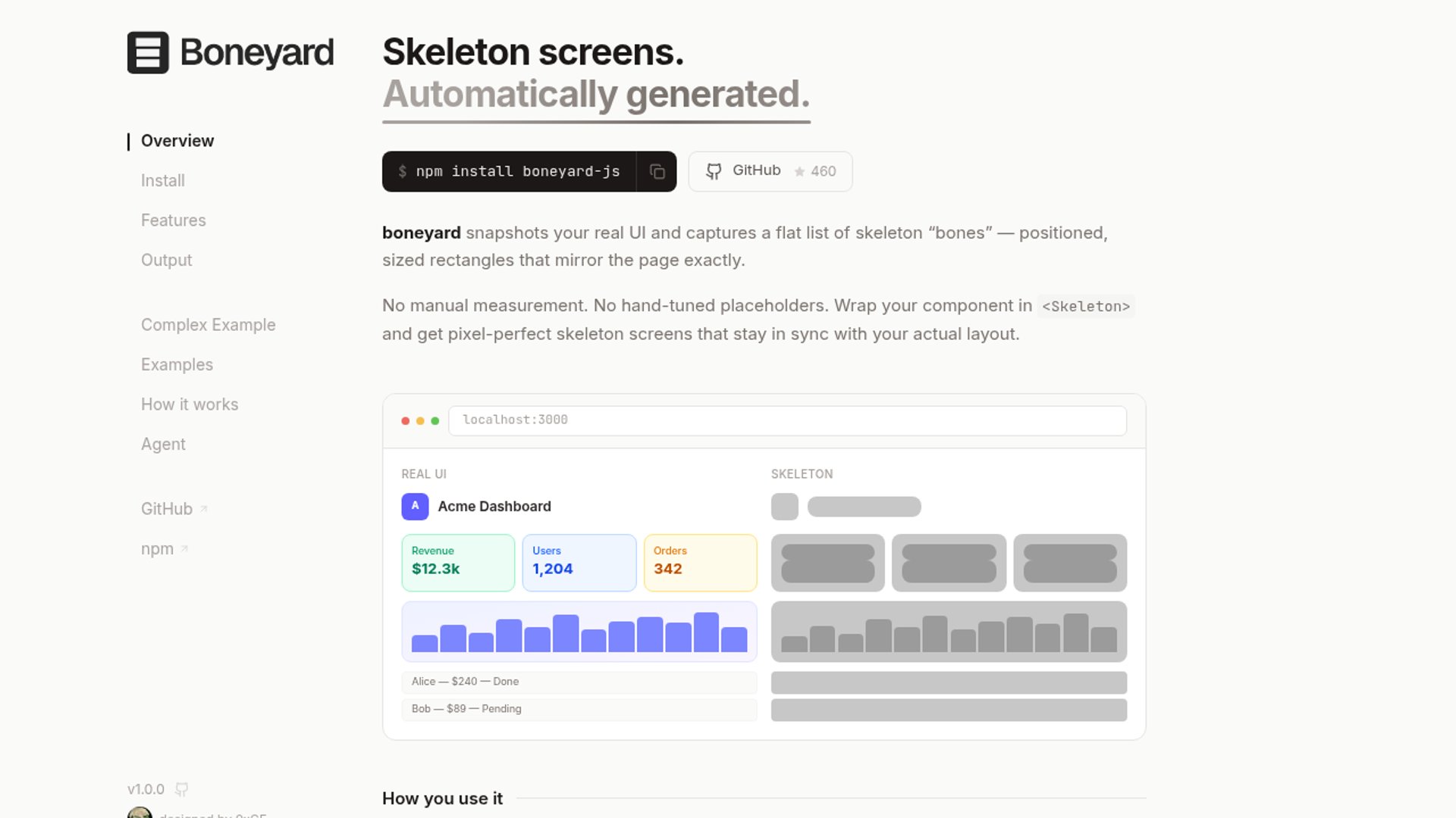 Boneyard is an open-source skeleton loading framework that snapshots a live UI and automatically generates accurate placeholder bones. This eliminates manual tuning of dimensions and keeps loading states perfectly synchronized with the real layout.