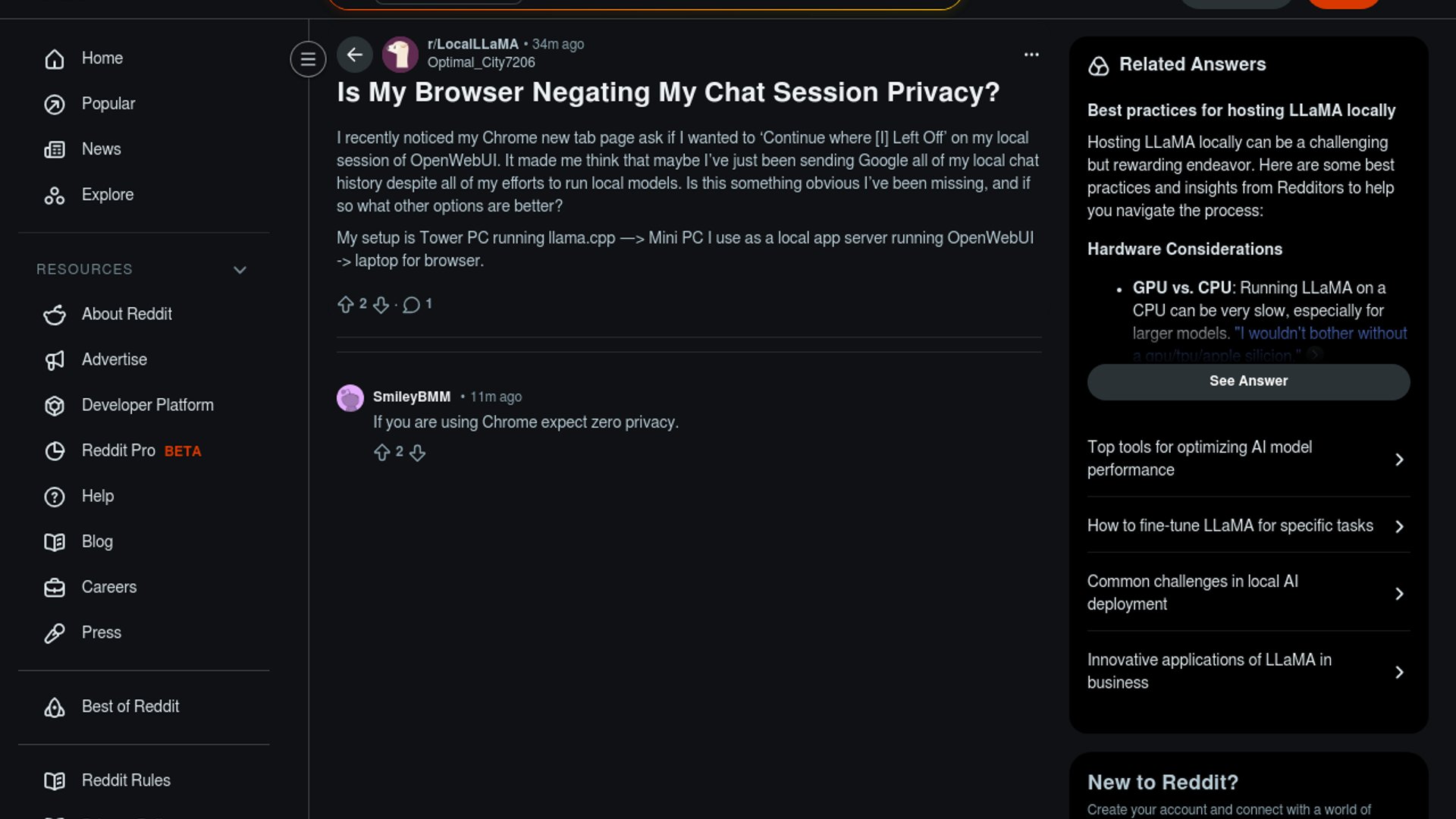 The post asks whether a local stack, with llama.cpp on a tower, Open WebUI on a mini PC, and Chrome on a laptop, is quietly losing privacy at the browser layer. Open WebUI is designed to run self-hosted and offline, but Chrome's session restore is separate from Chrome sync, so the real privacy boundary is the browser profile plus whatever history the Open WebUI server keeps.