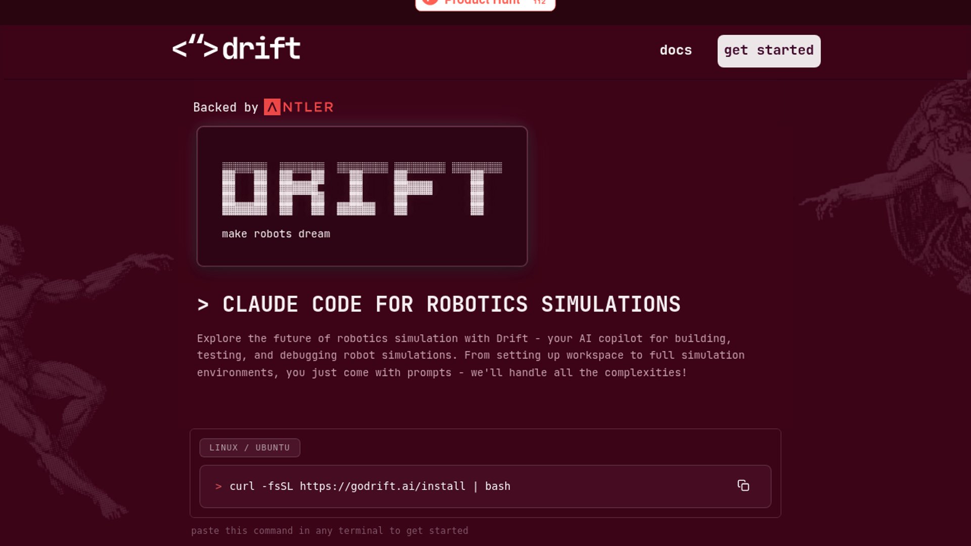 Drift is a terminal-first AI agent for robotics simulations that turns prompts into ROS setup, simulator orchestration, plugins, and OS glue. The launch is still early-access flavored, but the pitch is to make robot sims 10x faster and more reliable by automating the repetitive setup and debugging work.