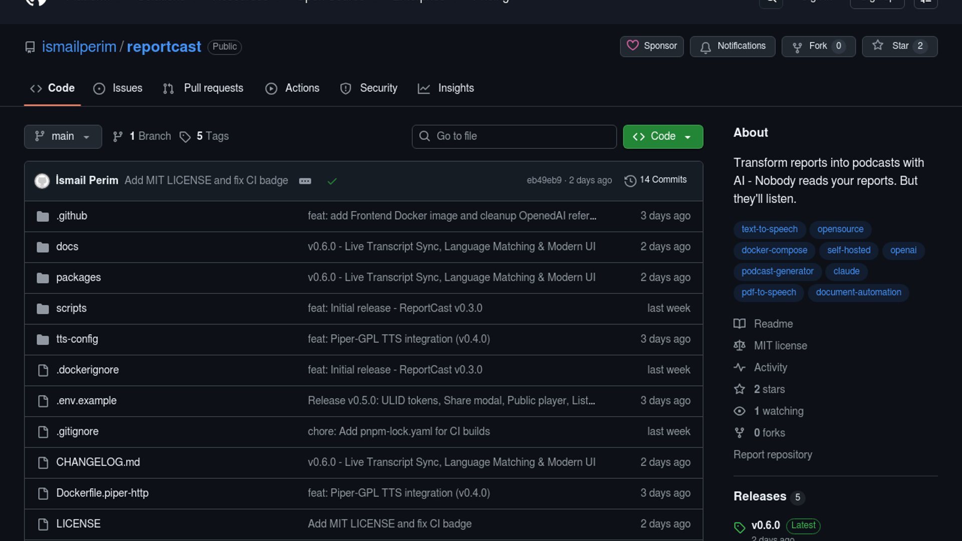 ReportCast is an MIT-licensed, open-source tool that converts PDF reports into AI-narrated podcasts using OpenAI or Claude for script generation and self-hosted Piper TTS for audio. It supports 19 voices across 7 languages, deploys via Docker, and includes a live transcript that highlights in sync with playback.