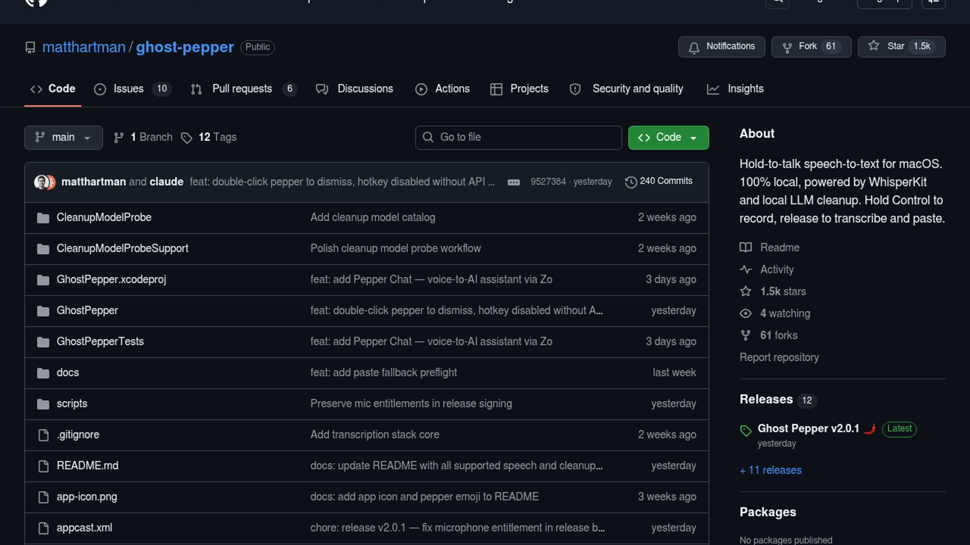 Ghost Pepper is an open-source macOS application that provides private, on-device speech-to-text with a hold-to-talk interface and automatic filler word removal for clean dictation.