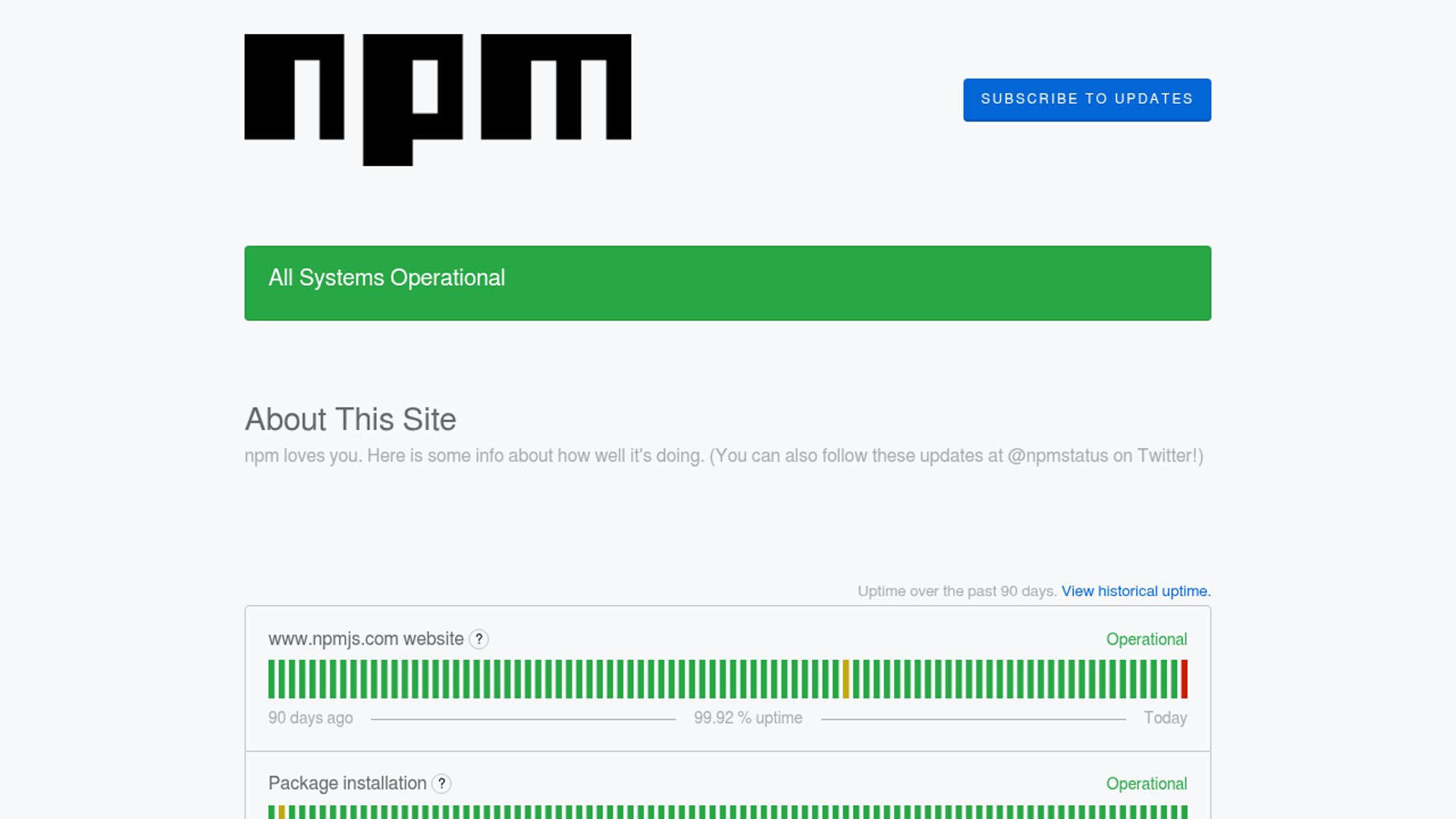 npm status page logs brief outage