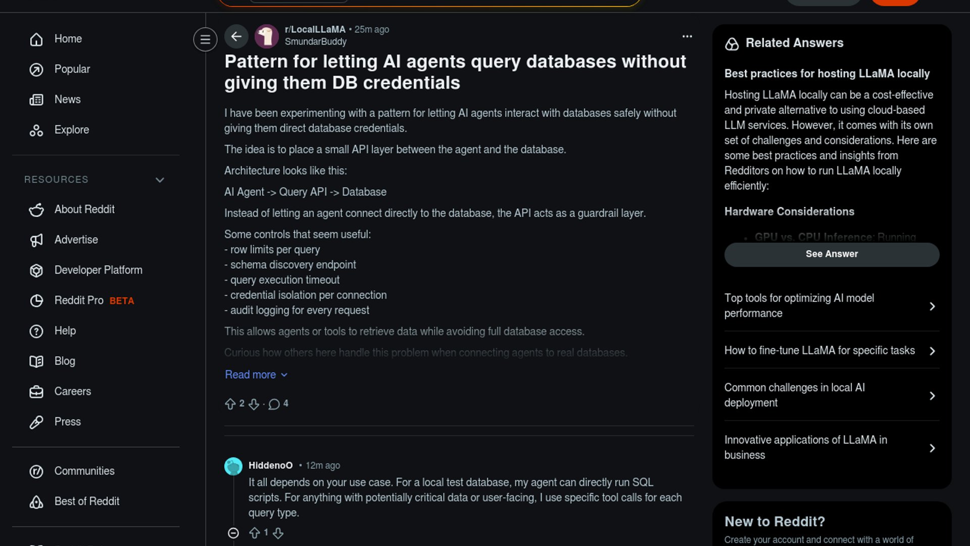 A developer shares a pattern for safely connecting AI agents to databases via a thin API middleware layer, avoiding direct credential exposure. The approach adds controls like row limits, schema discovery, timeouts, and audit logging between the agent and the database.
