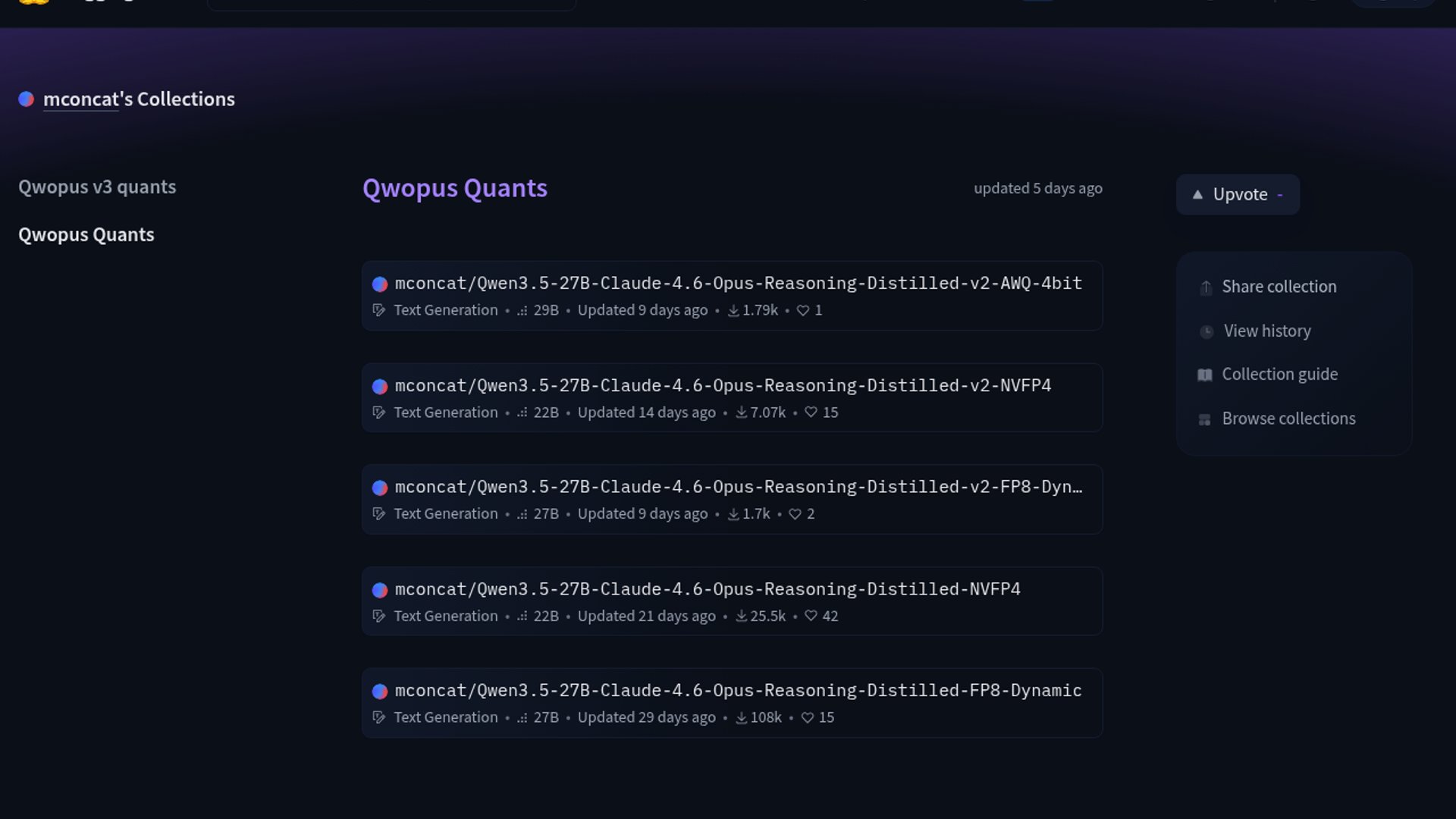 The Qwopus v3 collection adds mixed-precision builds of Jackrong/Qwopus3.5-27B-v3, including NVFP4, AWQ-4bit, and FP8 dynamic variants. The NVFP4 checkpoint is verified on vLLM with Blackwell hardware, aiming to make the model practical on smaller single-GPU setups.