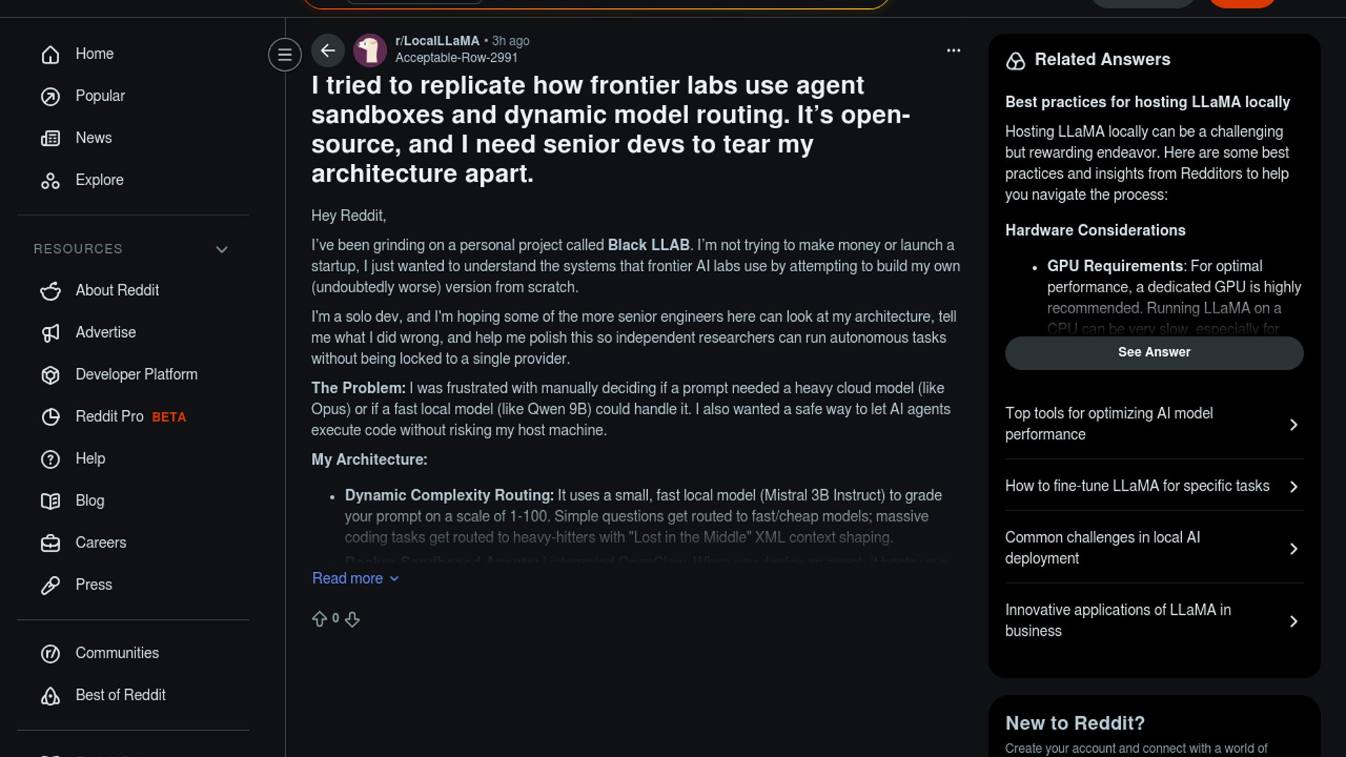 - –Score 0, zero comments on Reddit at time of scrape — this is brand new; the architecture deserves more eyeballs than it's gotten