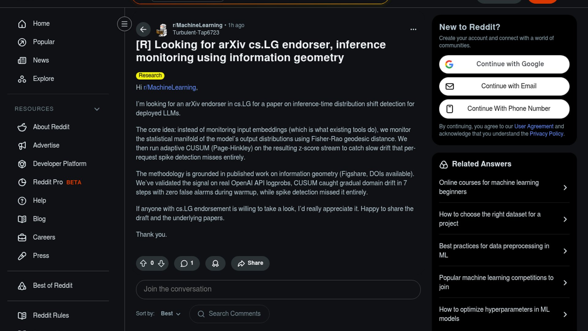 A Reddit post is seeking a cs.LG endorser for an unreleased paper on inference-time drift detection for deployed LLMs. The method tracks output-distribution geometry with Fisher-Rao distance and feeds that signal into adaptive CUSUM to catch slow domain drift that spike detectors miss.