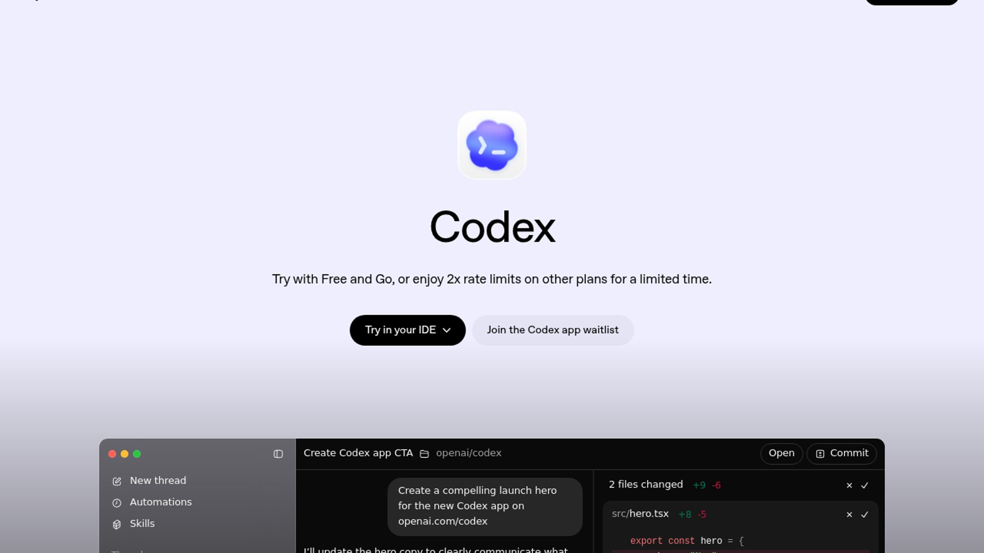 OpenAI is including Codex with ChatGPT Free and Go for a limited time while doubling rate limits on Plus, Pro, Business, Enterprise, and Edu plans. The change spans the app, CLI, IDE extension, and cloud, making Codex easier to work into everyday developer workflows.
