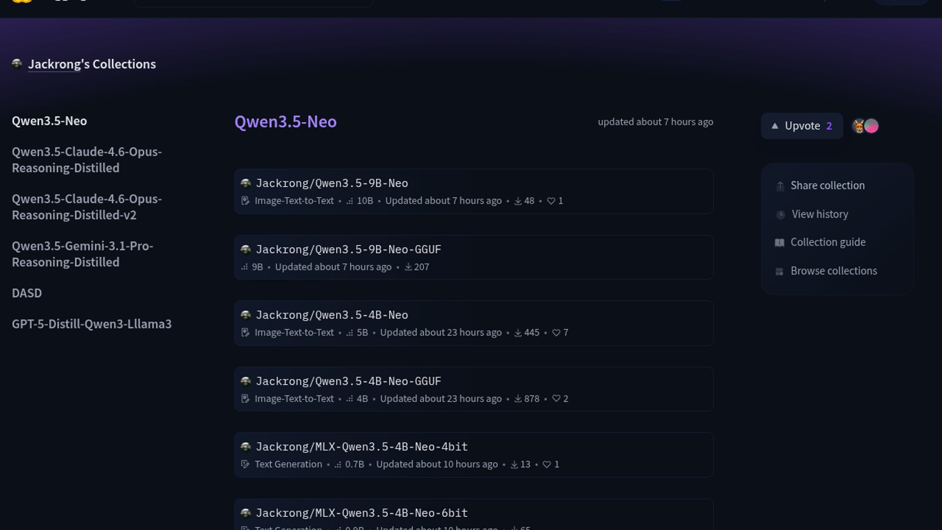 - –The collection's GGUF and MLX builds make it easy to try across local runtimes, and the Reddit thread immediately asks for broader benchmarks before anyone crowns it a winner: https://huggingface.co/collections/Jackrong/qwen35-neo https://www.reddit.com/r/LocalLLaMA/comments/1s270px/two_new_qwen35_neo_finetunes_focused_on_fast/