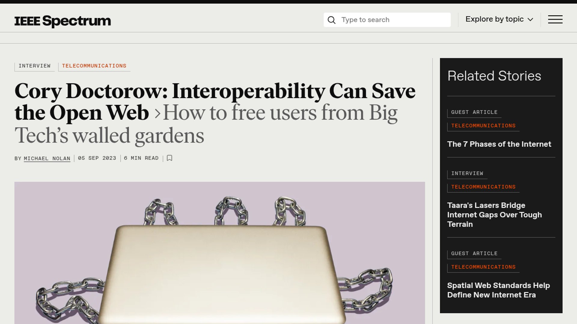 Cory Doctorow discusses how mandated interoperability can dismantle Big Tech monopolies and restore a healthy, open web ecosystem. He argues that lowering switching costs is essential for user freedom and market competition.
