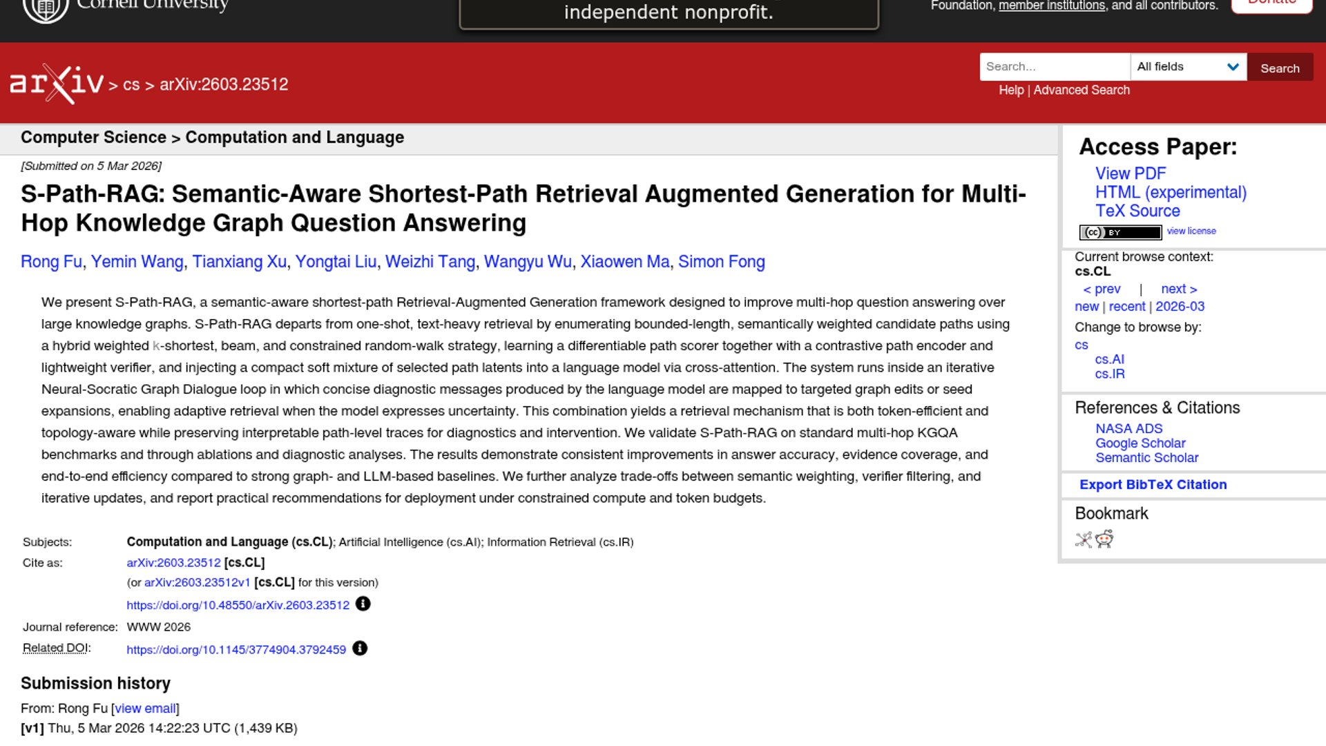 S-Path-RAG is a semantic-aware shortest-path RAG framework for multi-hop knowledge graph question answering, and it is listed in WWW 2026's accepted research tracks. The paper argues that bounded candidate-path search, a differentiable scorer, a lightweight verifier, and an iterative graph-dialogue loop can improve answer accuracy, evidence coverage, and efficiency.