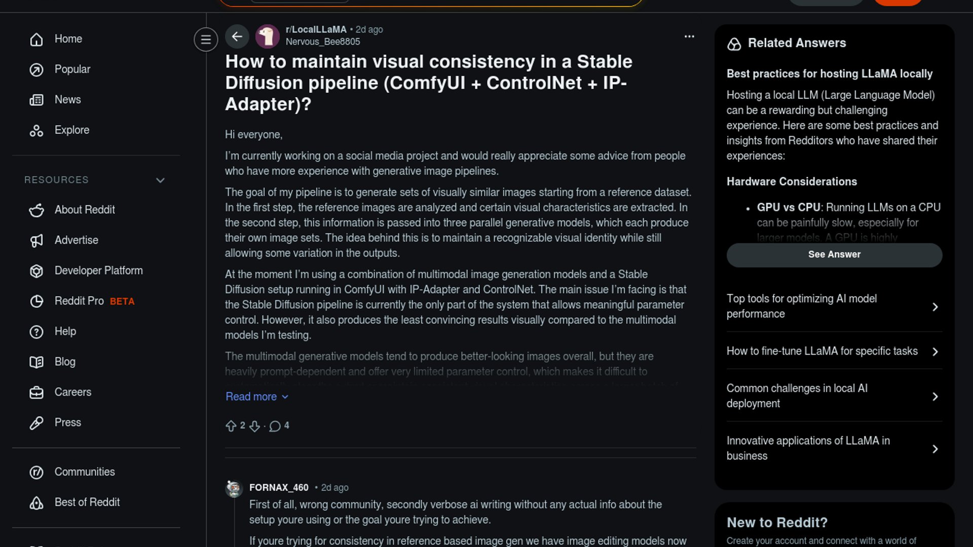 A LocalLLaMA user asks how to keep image batches visually consistent in a ComfyUI pipeline built around Stable Diffusion, ControlNet, and IP-Adapter. The short thread quickly turns into a broader debate over whether older diffusion control stacks can still match newer image-editing models on identity preservation and visual quality.