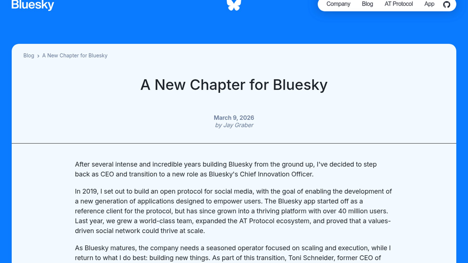- –Graber staying on as chief innovation officer suggests continuity for Bluesky's open social and AT Protocol strategy rather than a hard reset