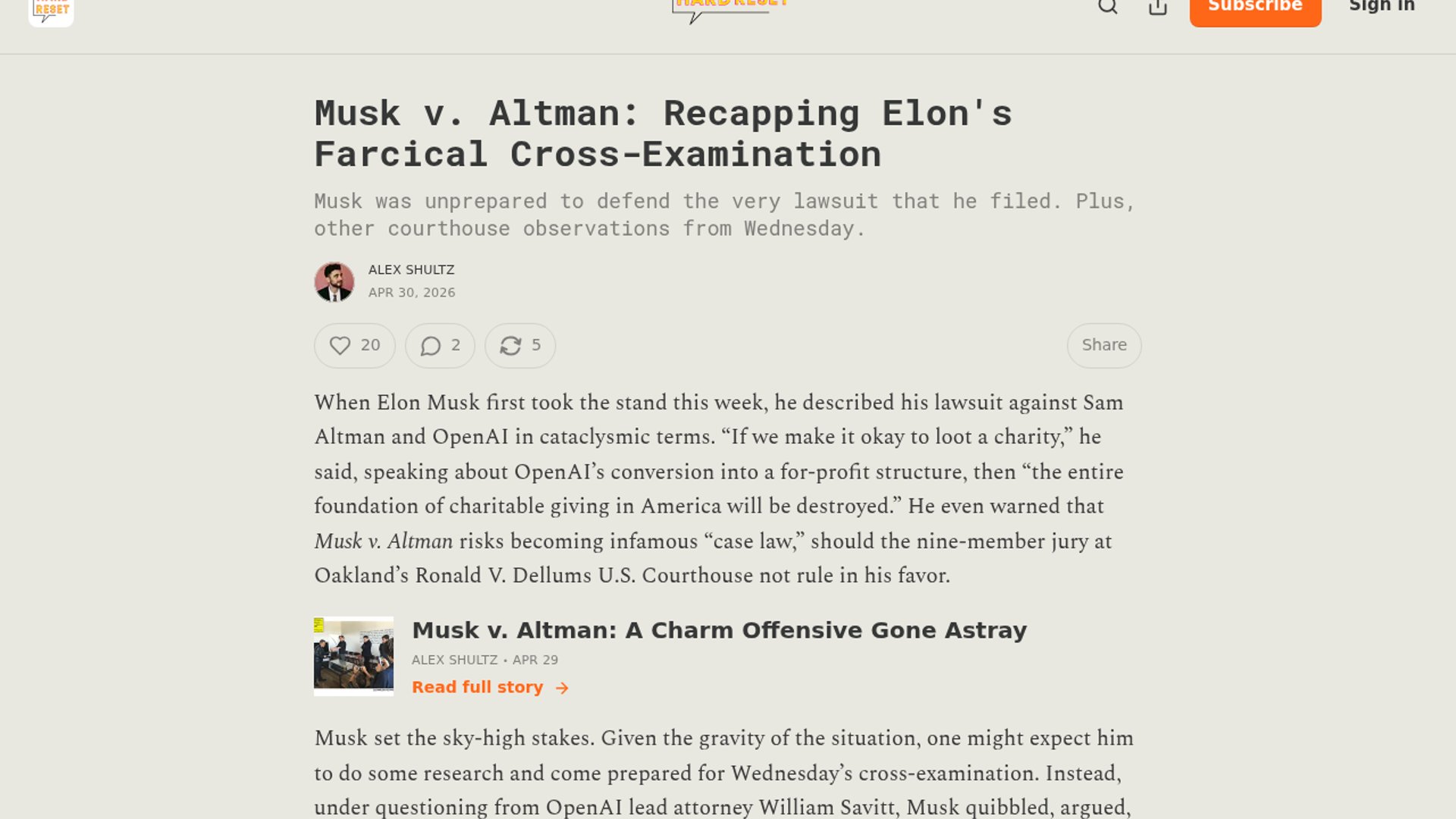 This Hard Reset recap says Elon Musk’s cross-examination in the OpenAI trial made him look poorly prepared, inconsistent, and unable to clearly explain either his safety objections or the factual basis for his lawsuit. The article frames the day as a public-relations and credibility disaster for Musk, with his testimony reinforcing the idea that the case may be driven more by rivalry and grievance than by principled concern.