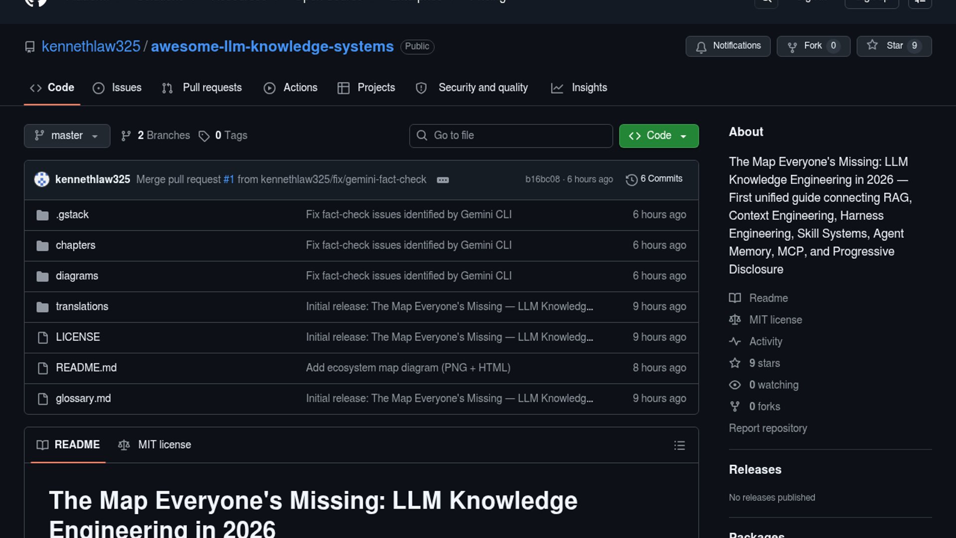 A free, MIT-licensed GitHub guide that tries to unify the modern LLM knowledge stack into one practical framework. It spans 11 chapters and around 21K words, covering RAG, long context, knowledge graphs, context engineering, harness engineering, MCP, agent memory, skill systems, progressive disclosure, and the Chinese AI ecosystem. The core pitch is that these topics are not separate trends but layers of the same runtime architecture for building better AI systems.