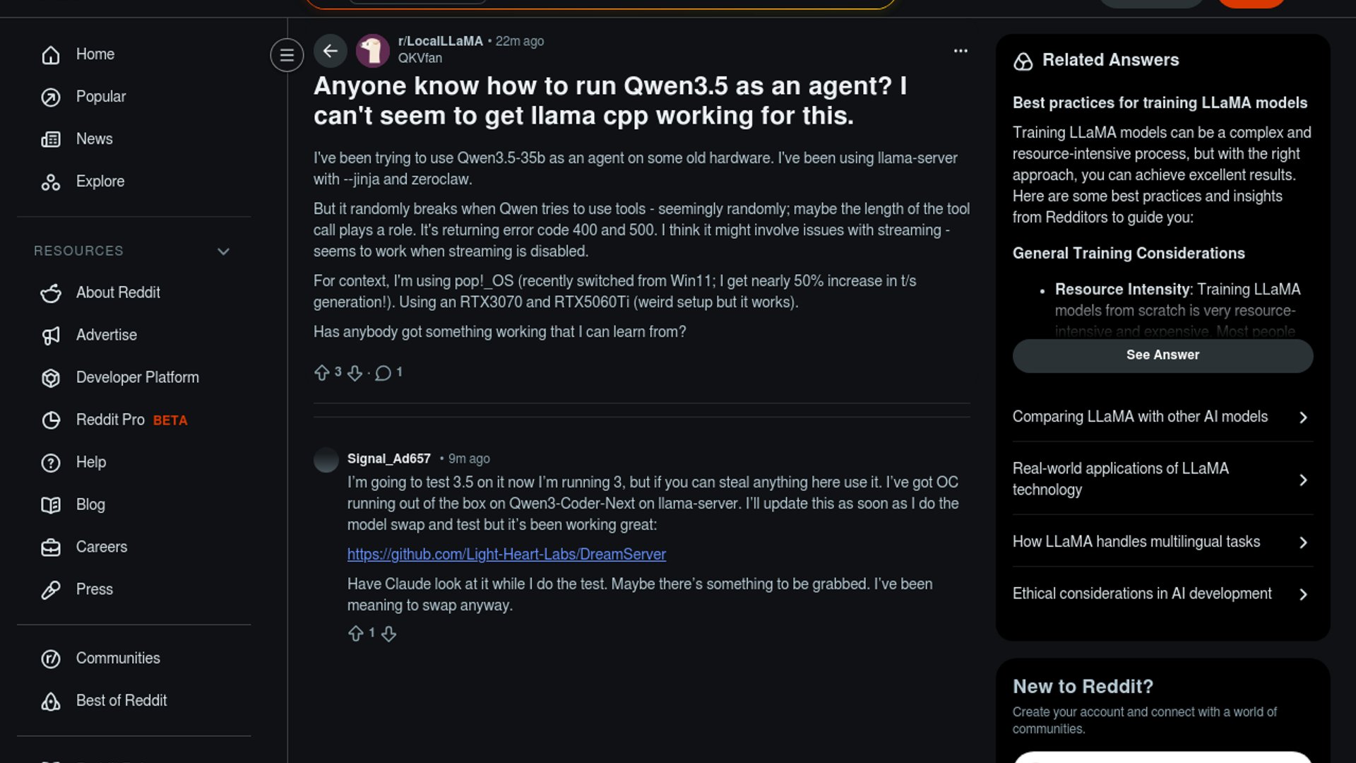 - –The only concrete answer in-thread points to DreamServer and says Qwen3-Coder-Next works out of the box on llama-server, suggesting template or runtime compatibility issues more than a hard model limitation.