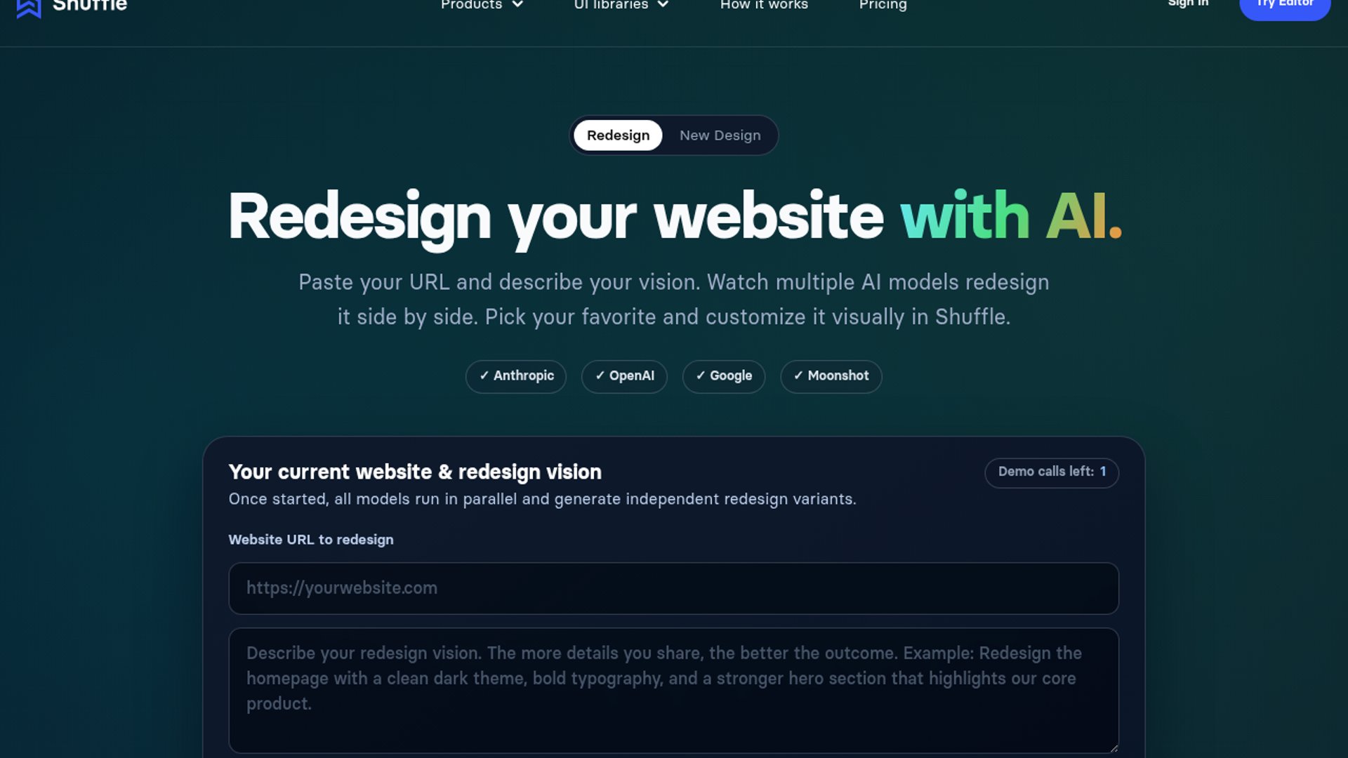 Shuffle's AI Website Redesign tool lets you paste a URL, describe a vision, and watch Claude Opus, GPT-5, Gemini, and Kimi generate competing redesigns side-by-side. Winners get refined in Shuffle's drag-and-drop editor and exported as production-ready Next.js, Laravel, or HTML code.