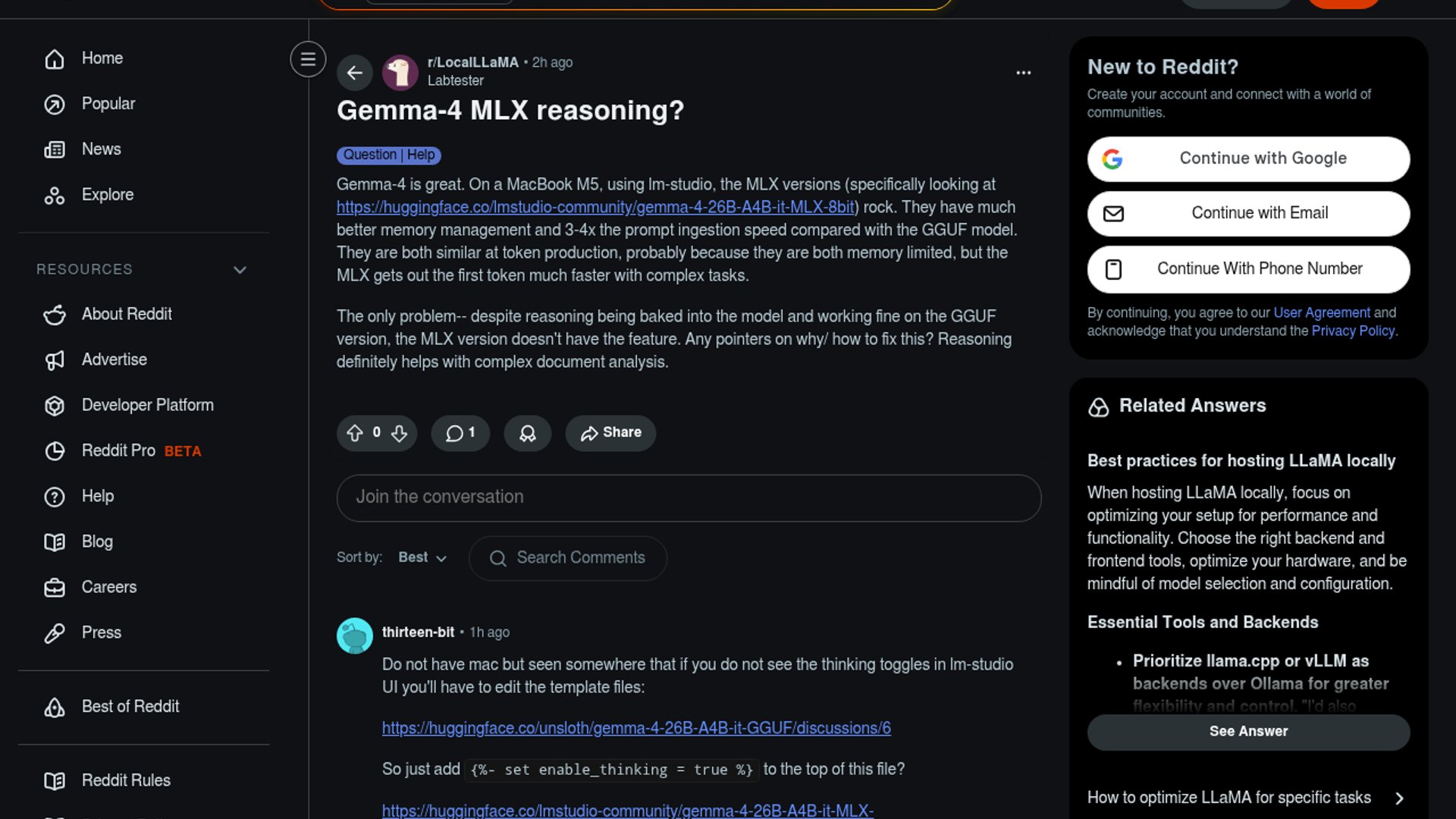 Gemma 4’s official release supports configurable thinking modes, but this Reddit thread says the LM Studio MLX build on Apple Silicon is not exposing that reasoning path. The likely culprit is chat-template/back-end wiring, not the base model weights.
