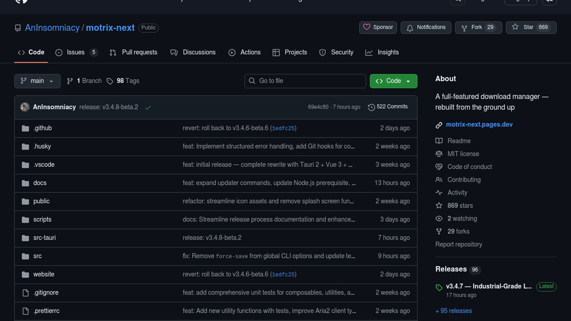 Motrix Next is a from-scratch rebuild of the Motrix download manager, aimed at users who want a modern, lightweight, cross-platform downloader without giving up the familiar power-user features. The project keeps aria2-style multi-protocol downloading, supports macOS, Windows, and Linux, and swaps the old Electron-era stack for Tauri 2, Vue 3, Rust, and TypeScript. The result is positioned as a practical utility release with broad appeal to developers and heavy download users who care about speed, footprint, and maintainability.