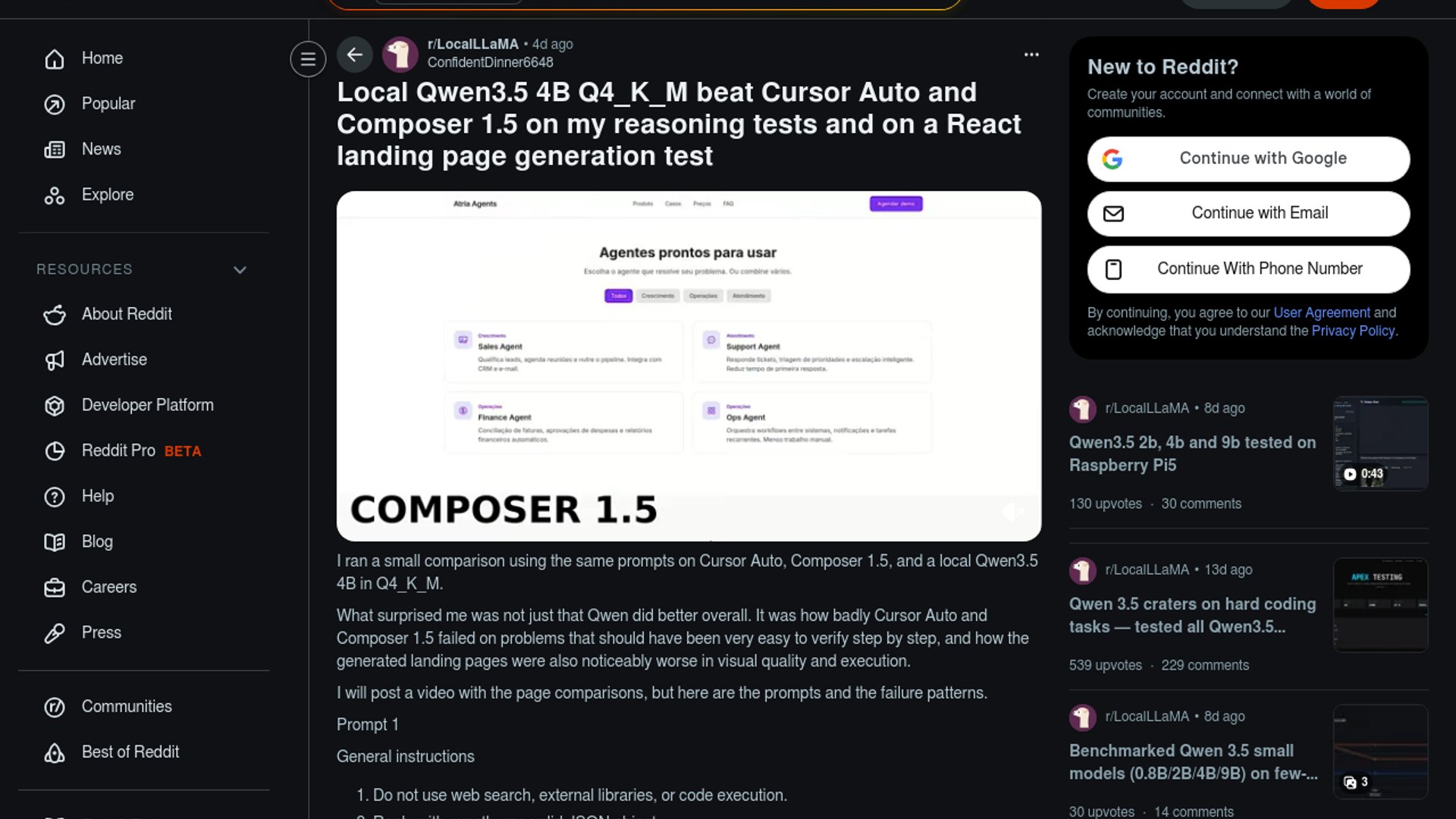 A LocalLLaMA post claims a local Qwen3.5 4B Q4_K_M setup beat Cursor Auto and Cursor Composer 1.5 on a structured reasoning prompt and a React landing page generation test. The author ran the model locally through LM Studio plus ngrok inside Cursor and argues that small local models can outperform heavier coding-agent workflows when correctness checks are shallow.