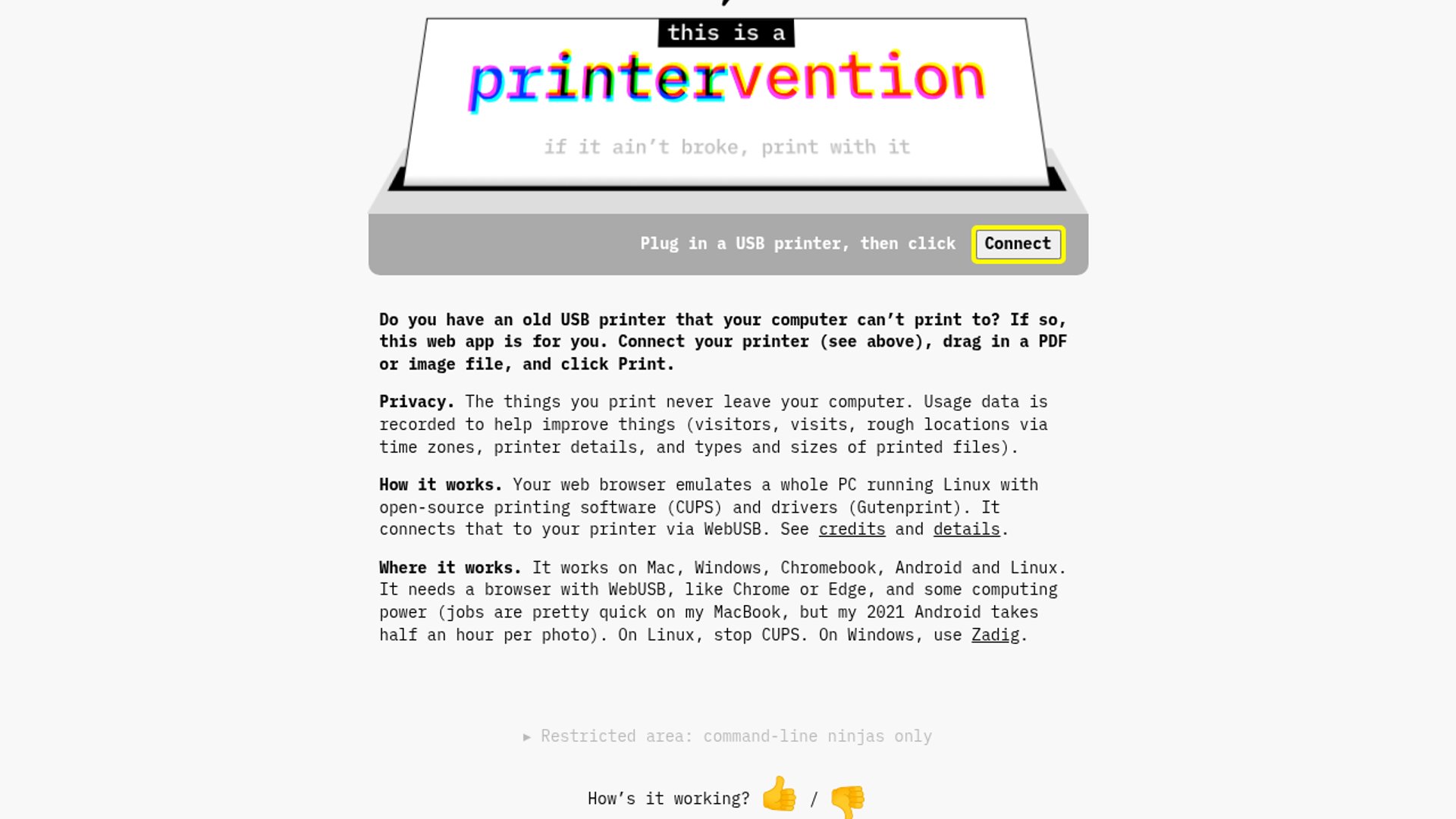 Printervention is a web app that lets modern browsers drive older, unsupported printers by running an Alpine Linux VM in v86, discovering the printer over WebUSB, and bridging print traffic through USB/IP. The project started as a way to revive a Canon SELPHY photo printer, then expanded into a broader attempt to make legacy printer support installation-free and usable on non-Linux machines. It also handles driver selection, photo sizing, HEIC conversion, and basic telemetry, with a scanning prototype already explored as a follow-on use case.